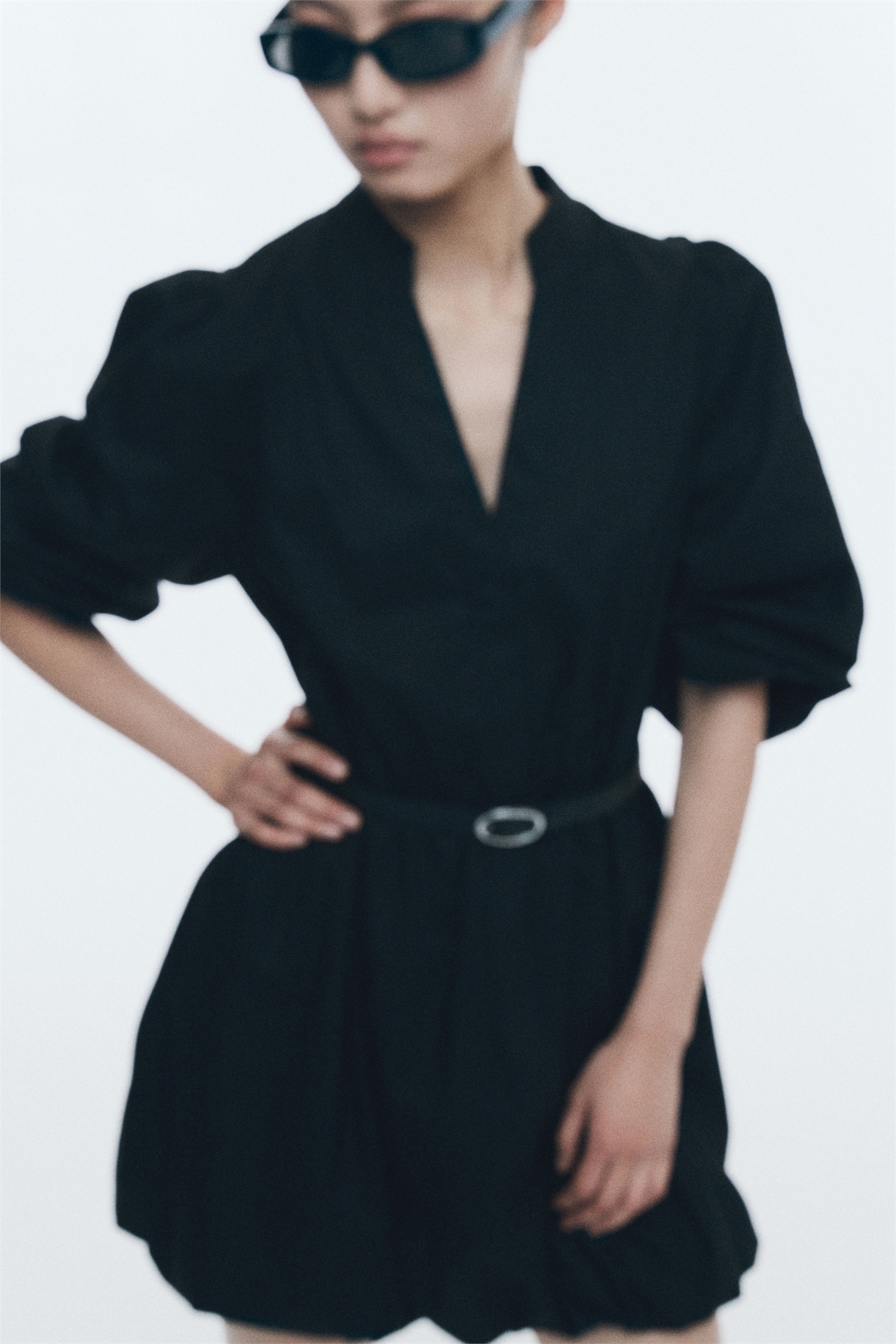 Короткое платье из хлопкового полотна с воротником-стойкой, глубокой V-образной проймой спереди, эластичной резинкой на талии и съемным поясом с овальной металлической пряжкой. Длинные объемные рукава-баллоны с эластичными манжетами и юбка на подкладке для пышного силуэта.