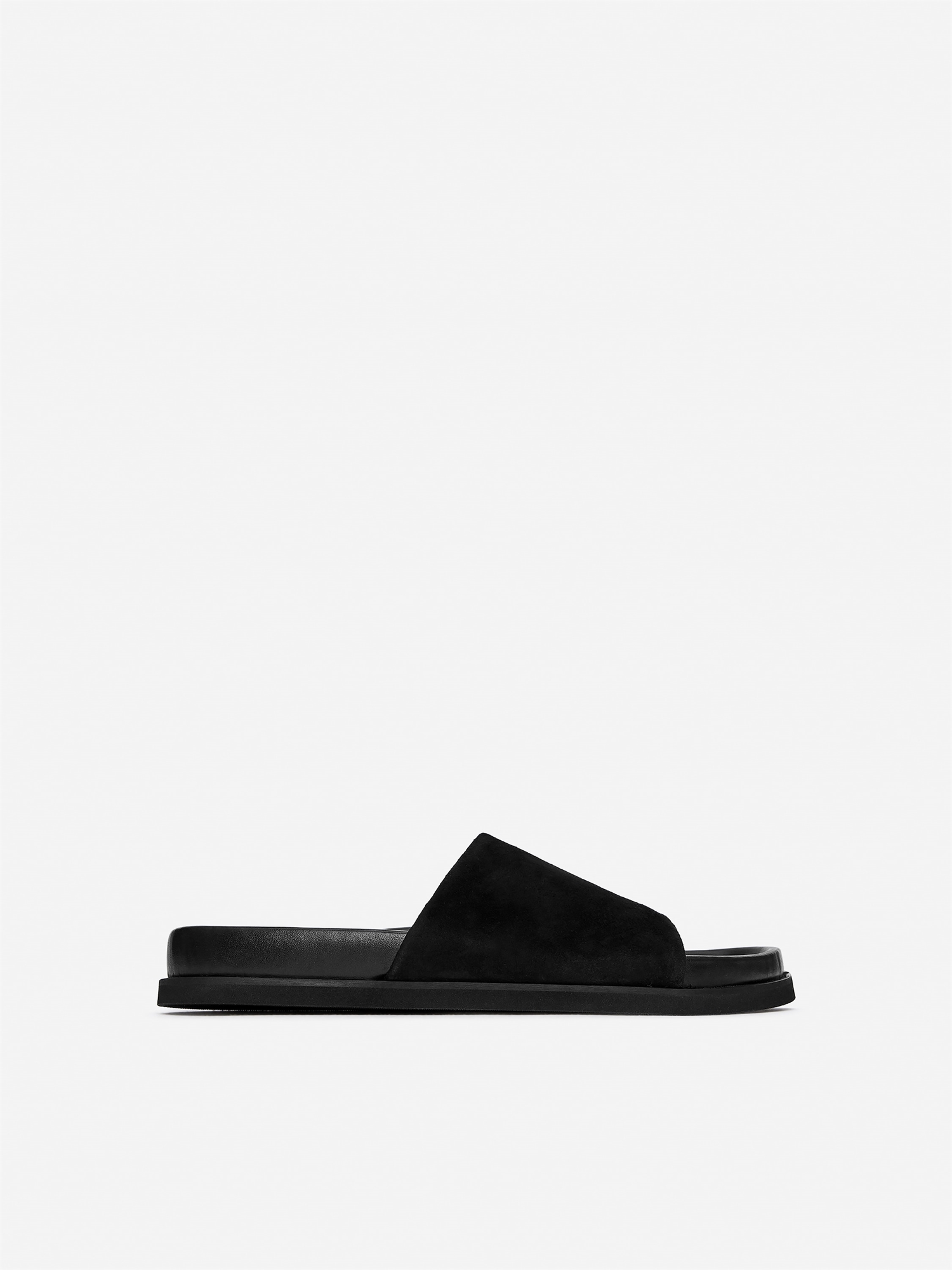 Сандалии-слипы из замши, прошедшей процесс дубления без использования хрома. Открытый носок и резиновая подошва.