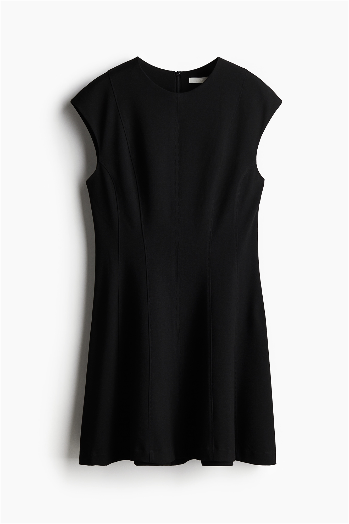 Короткое платье из слегка тянущейся саржи с видимыми швами спереди и сзади. Круглый вырез, рукава-капельки и потайная застежка-молния сзади. Зауженная талия и расклешенная юбка придают силуэту утонченность. Без подкладки.