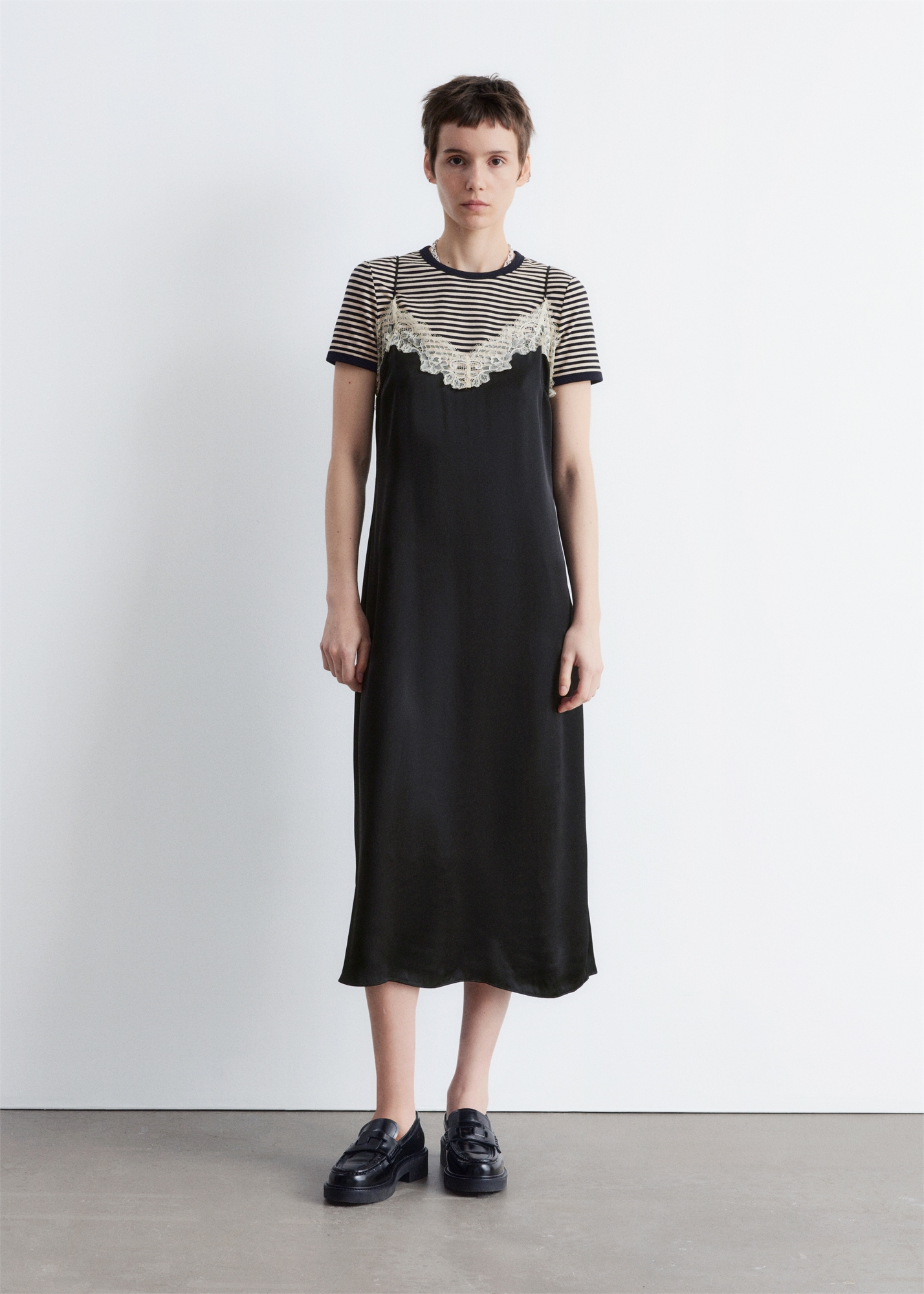 Возрожденная икона 90-х, это минималистичное платье-слип сшито из блестящего атласа и имеет прямой, облегающий силуэт. Нежные бретельки-спагетти и классический V-образный вырез украшены кружевной отделкой. Застегивается на потайную молнию в боковом шве. Длина платья: 96,7 см / 38" (EU 36 / UK 8 / US 4)
