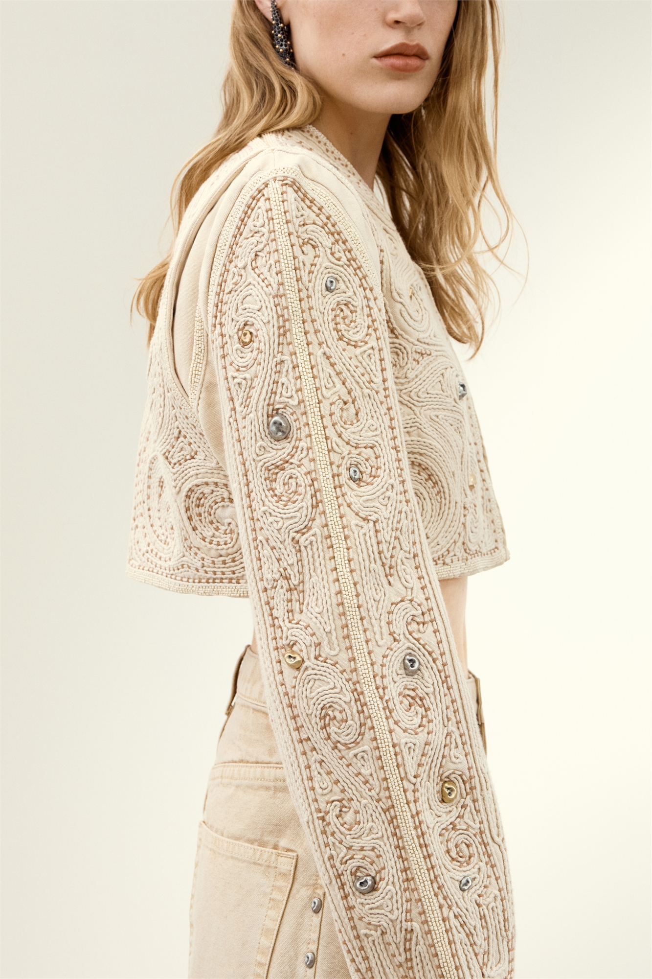 Коллекция Studio. Короткий блейзер из прочного хлопкового холста с большими участками сложной вышивки, украшенной металлическими шипами и мелкими стеклянными бусинами. V-образный вырез с вырезами спереди для декоративного эффекта и потайные застежки-крючки спереди. Внутренний карман и длинные рукава с ластовицей для большей подвижности. Подкладка из хлопкового вуаля.