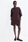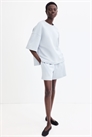 Топ оверсайз из легкой толстовочной ткани с горловиной, спущенными плечами и рукавами длиной до локтя. Подол прямого кроя с разрезом с каждой стороны.