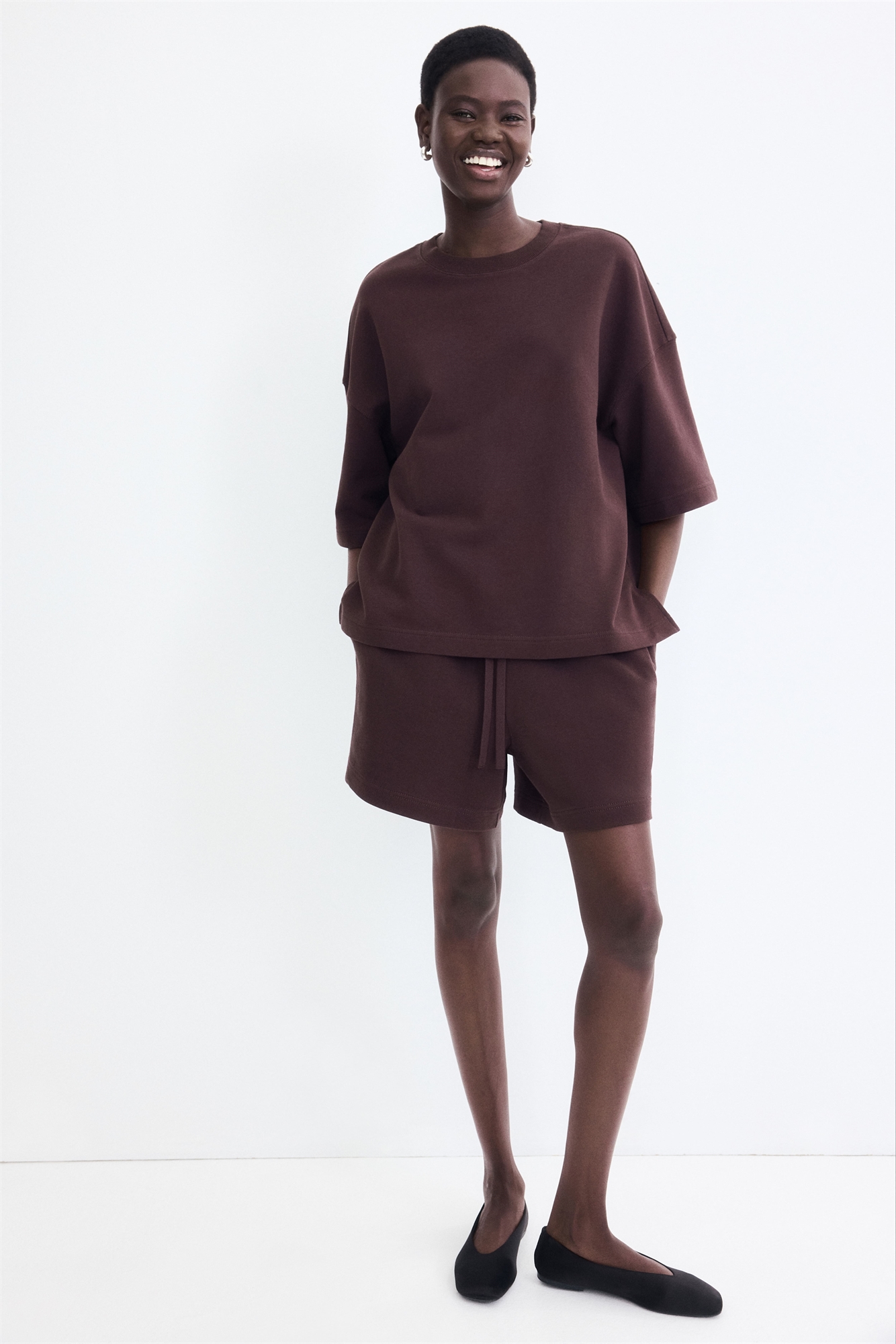 Топ оверсайз из легкой толстовочной ткани с горловиной, спущенными плечами и рукавами длиной до локтя. Подол прямого кроя с разрезом с каждой стороны.