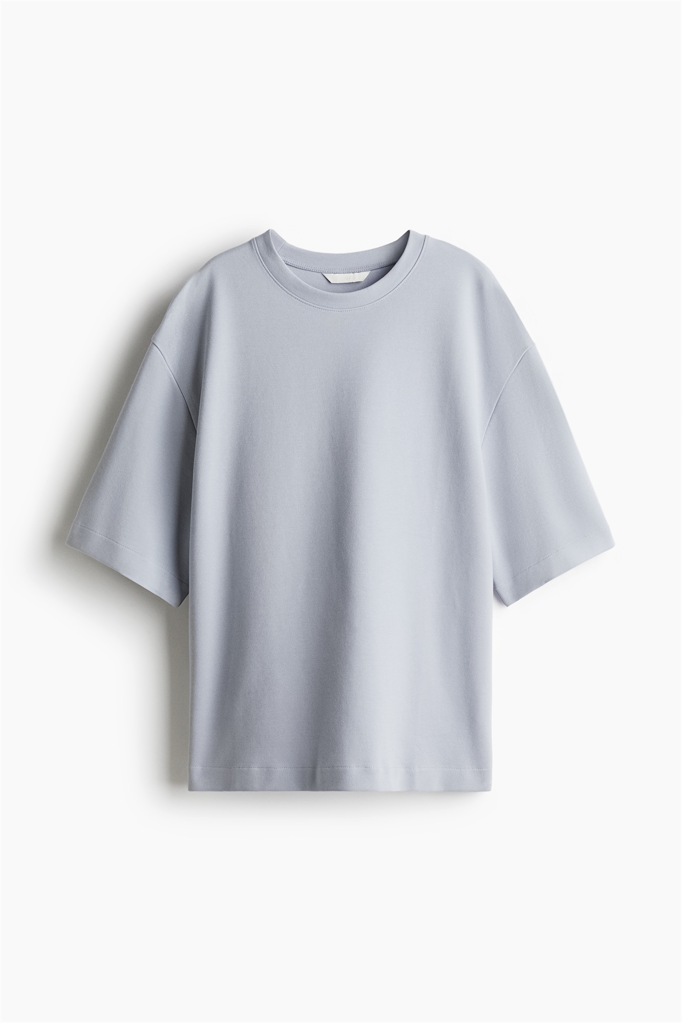 Футболка в стиле бокси из плотного интерлока, изготовленного из смеси хлопка. Свободный крой с горловиной, спущенными плечами и рукавами, заканчивающимися чуть выше локтей.