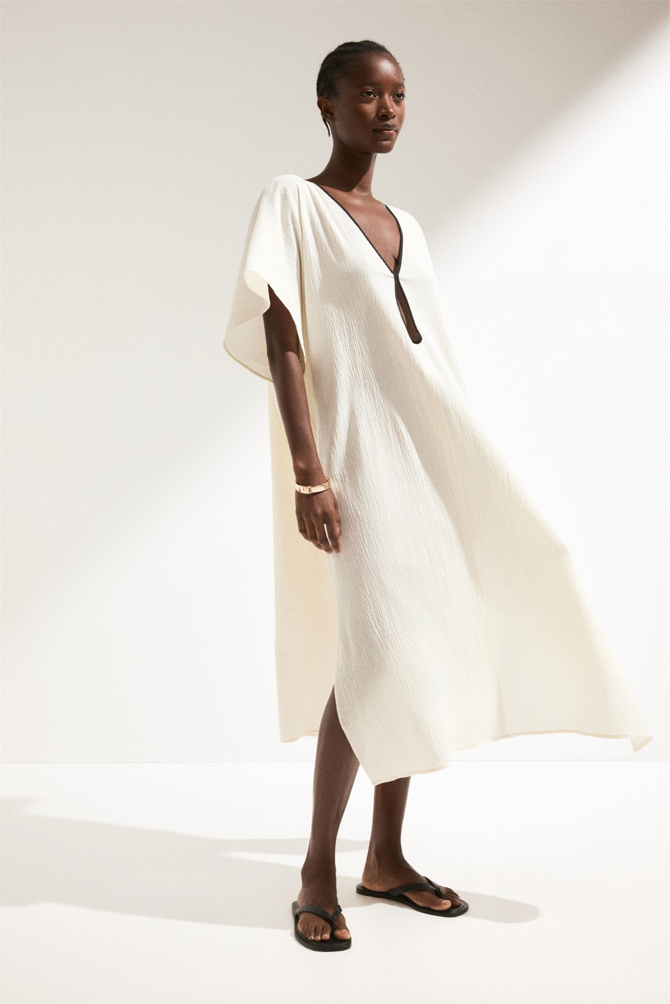Пляжный кафтан свободного покроя из полотняного переплетения. Глубокий V-образный вырез и отверстие для ключа в центре бюста, подчеркнутые отделкой контрастного цвета.