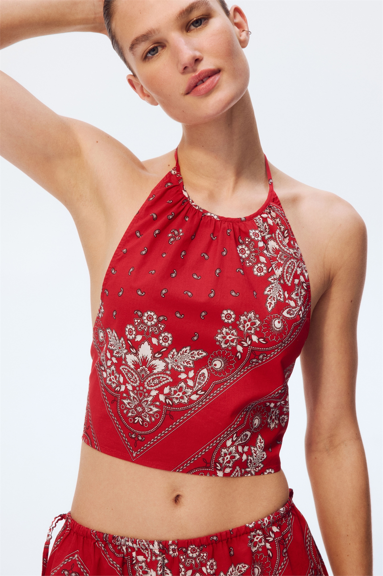Короткий пляжный топ из воздушного хлопкового полотна с круглым вырезом и узкими завязками. Открытая спина с широкими завязками.