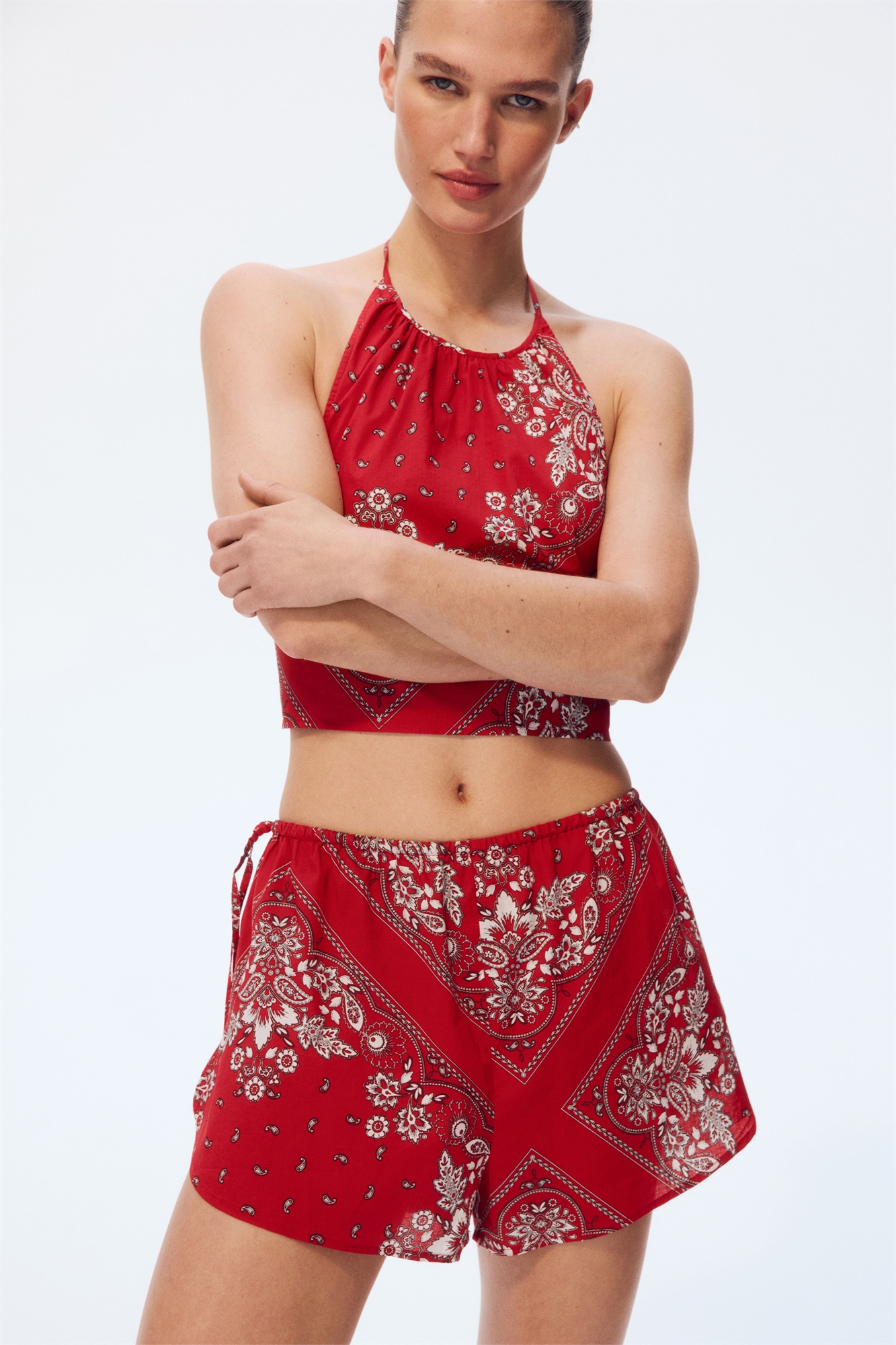 Пляжные шорты из воздушного хлопкового полотна с узкой эластичной резинкой на талии и декоративными завязками-спагетти по бокам. Загнутые края.