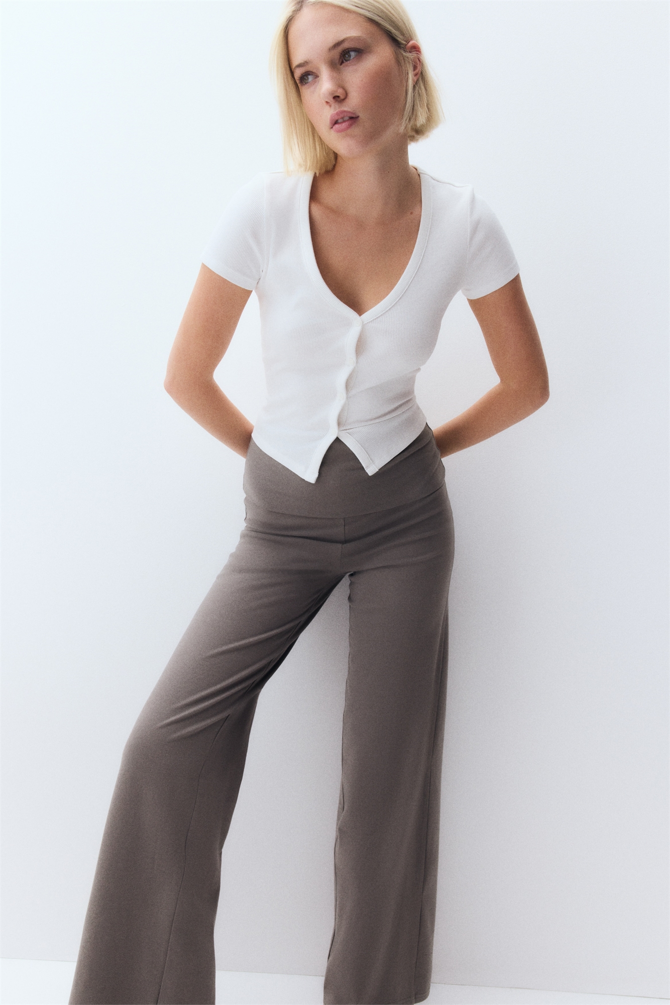 Широкие брюки из мягкого трикотажа с откидным поясом и сборками по бокам, создающими эффект драпировки.