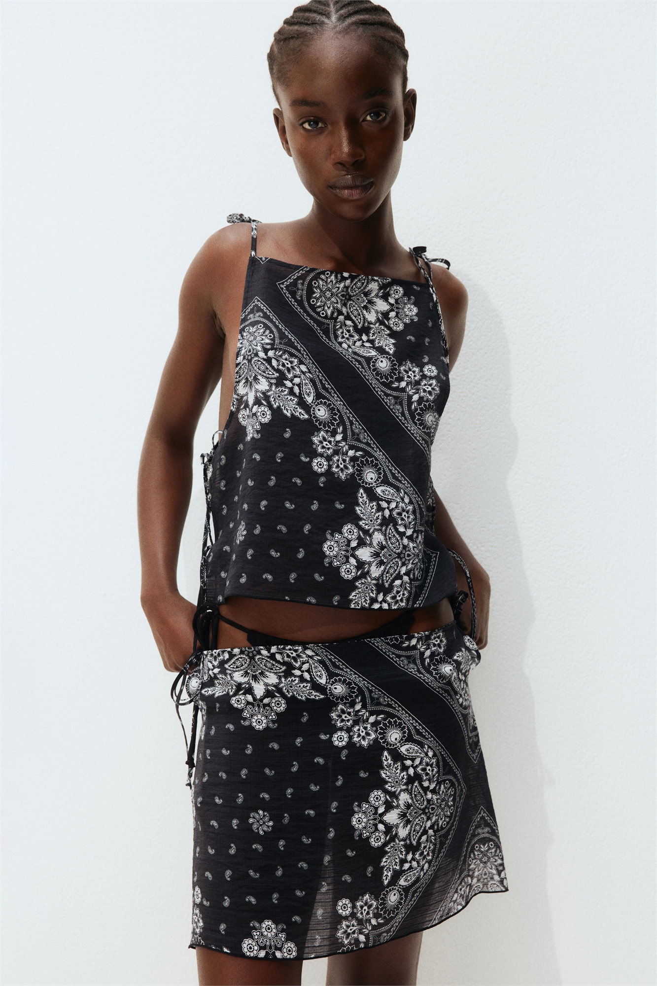 Короткая пляжная юбка из полотняного переплетения с отверстием для ключа и завязками-спагетти с каждой стороны. Оверлочный край по подолу. Без подкладки.