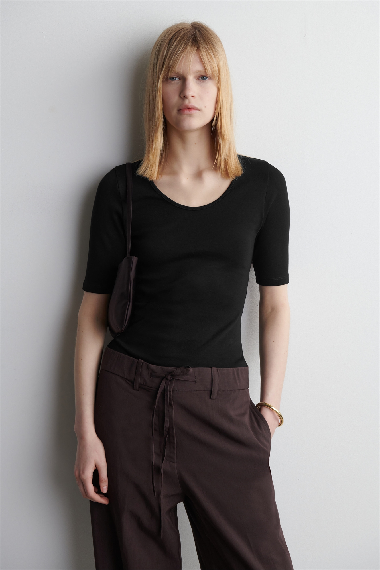 Пересмотренная классика, эта облегающая футболка станет ключевым дополнением к любой базовой коллекции. Горловина с эффектом "совок", спускающаяся вниз по изгибу, и простроченные швы. Носите ее как основу для последующих слоев или как самостоятельную вещь с джинсами. Зауженный крой 230gsm Органический хлопок выращен из негенетически модифицированных семян без использования химических удобрений и пестицидов Ткань: 100% органический хлопок. Без учета отделки / Машинная стирка Длина по спинке размера S составляет 53,2 см / Модель носит размер S