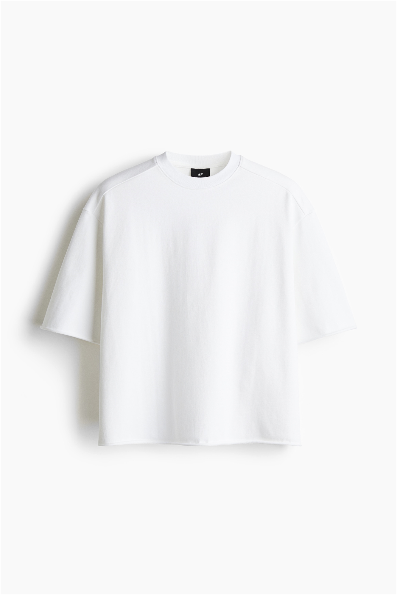 Широкая футболка boxy-fit из плотного хлопкового джерси с круглым вырезом, отделанным ребрами, вырезом сзади, спущенными плечами и необработанным подолом. Крой оверсайз обеспечивает мешковатый и свободный силуэт.