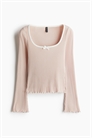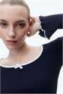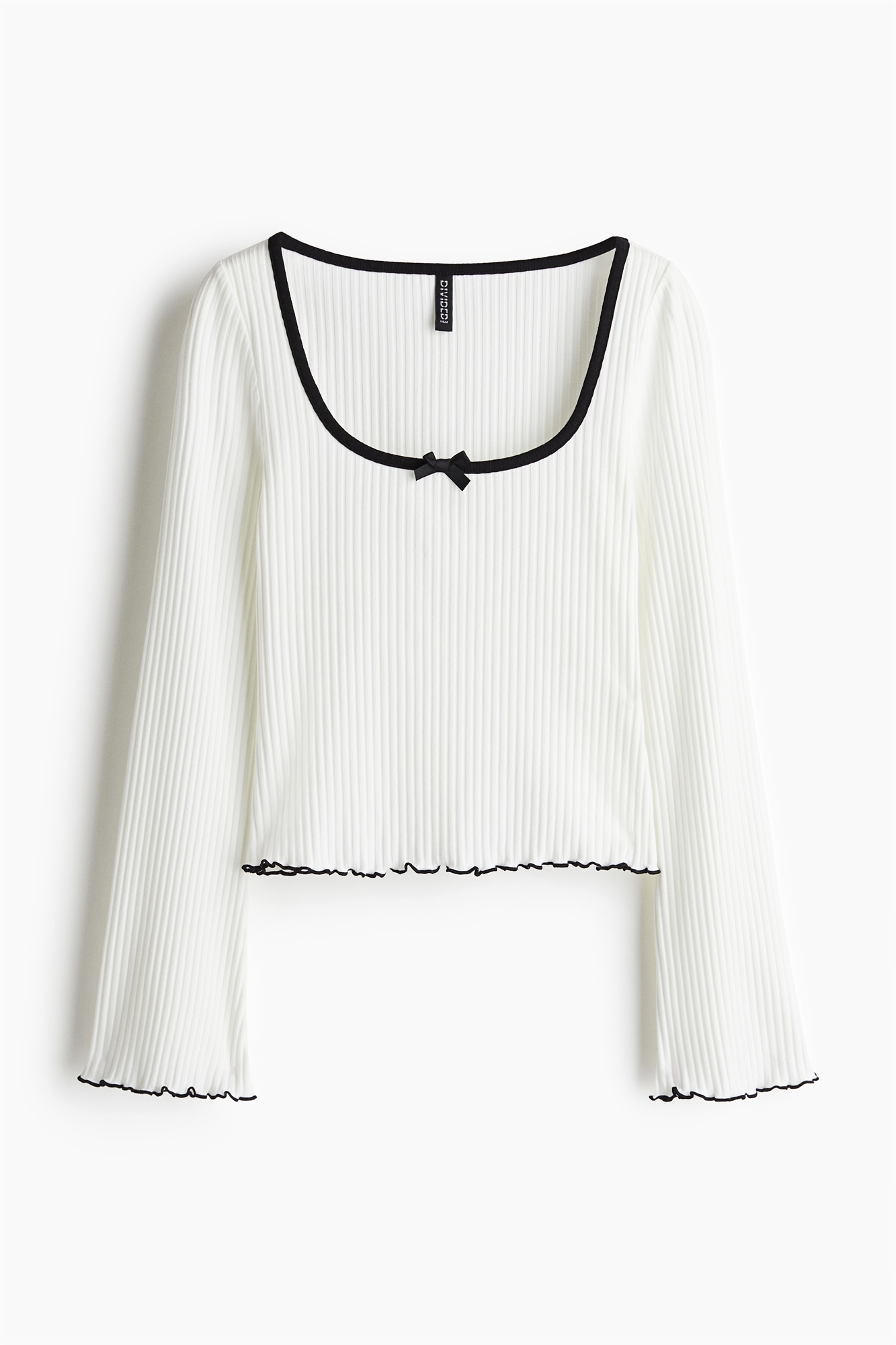 Короткий приталенный топ из ребристого джерси. Глубокий квадратный вырез с узкой окантовкой и декоративным атласным бантом спереди, оба акцентного цвета. Длинные рукава-трубы, манжеты и подол обработаны оверлоком и украшены акцентным цветом.