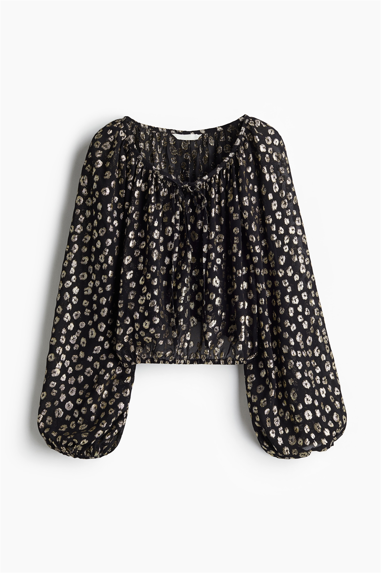 Короткая блузка большого размера из жаккардового переплетения с переливающимся узором. Круглый вырез с V-образной проймой и узкими завязками спереди. Длинные рукава реглан с эластичными манжетами и эластичной отделкой по подолу.