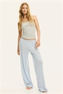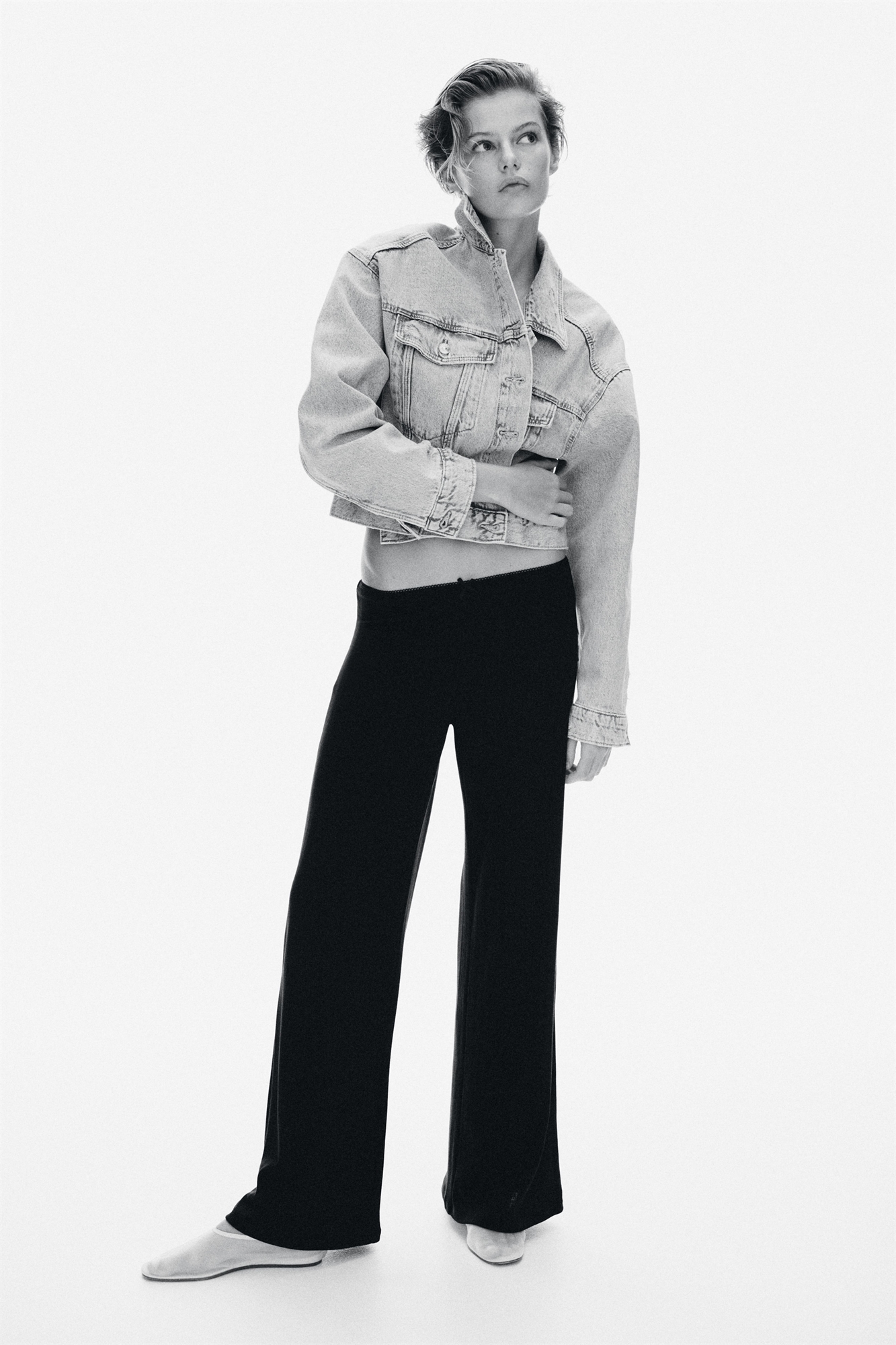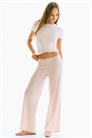 Брюки из мягкого трикотажа пуантель с заниженной талией и эластичной отделкой пико, украшенной маленьким атласным бантиком. Облегающий верх с широкими ногами.