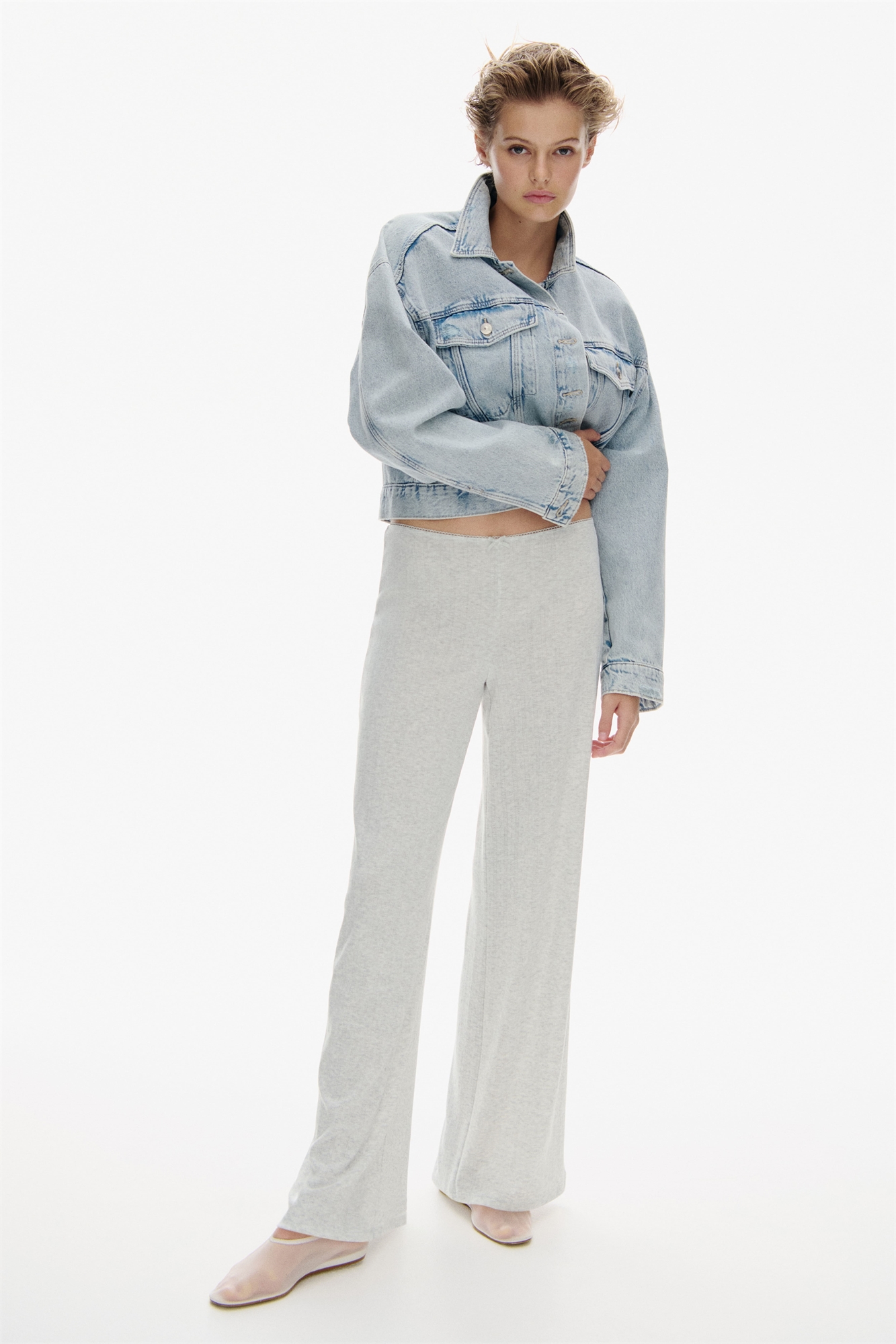 Брюки из мягкого трикотажа пуантель с заниженной талией и эластичной отделкой пико, украшенной маленьким атласным бантиком. Облегающий верх с широкими ногами.