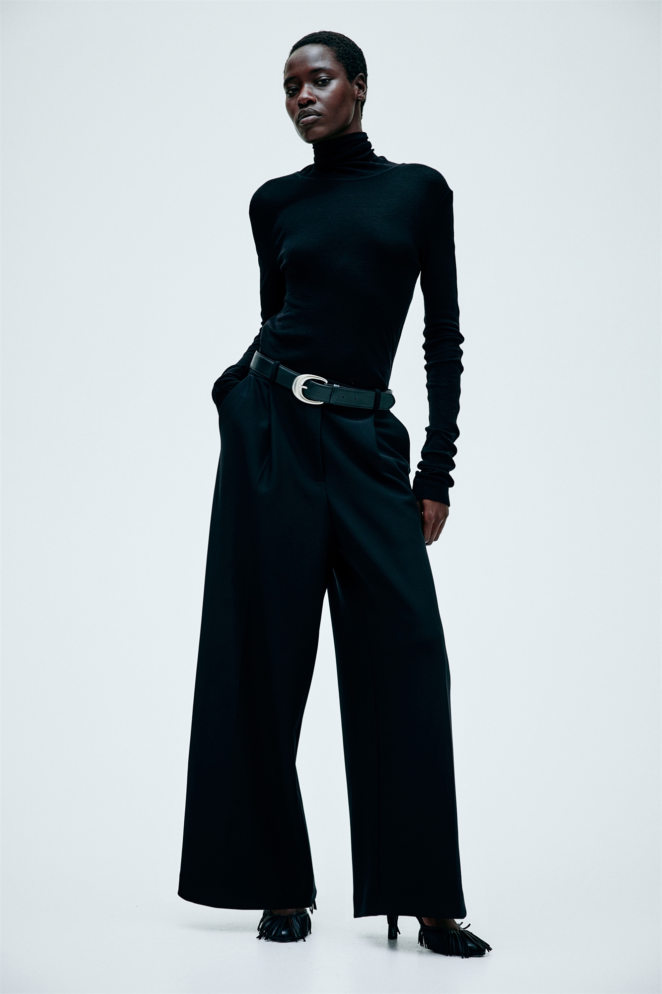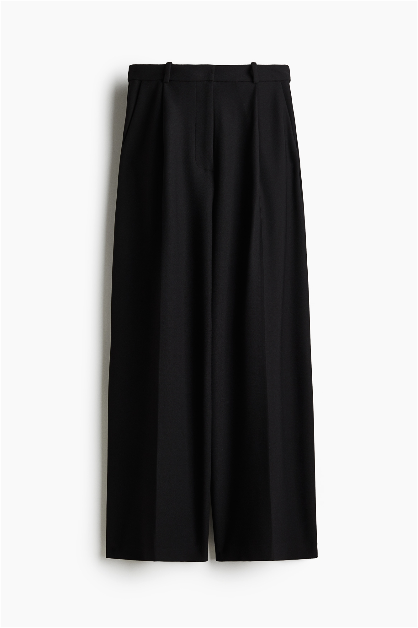 Свободные брюки из плотного джерси с ширинкой на молнии и потайными застежками-крючками. Диагональные боковые карманы, втачные карманы сзади и прямые ноги со складками спереди и складками спереди и сзади.