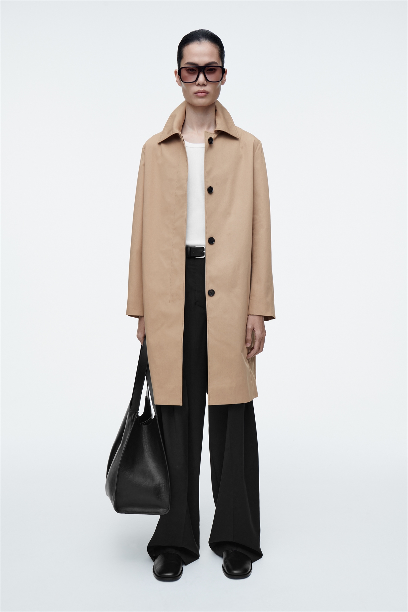 Это автомобильное пальто средней длины, выполненное в нейтральном бежевом цвете, сшито из легкого хрустящего хлопка, что делает его идеальным вариантом для межсезонья. Заостренный воротник, потайная застежка и тонкие карманы в боковых швах придают ему аккуратный силуэт. Регулярный крой Застежка на пуговицы Материал: 100% хлопок. Без учета отделки / Машинная стирка Длина по спинке для размера EU 36 составляет 93,9 см / Модель носит размер EU 36