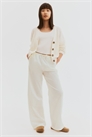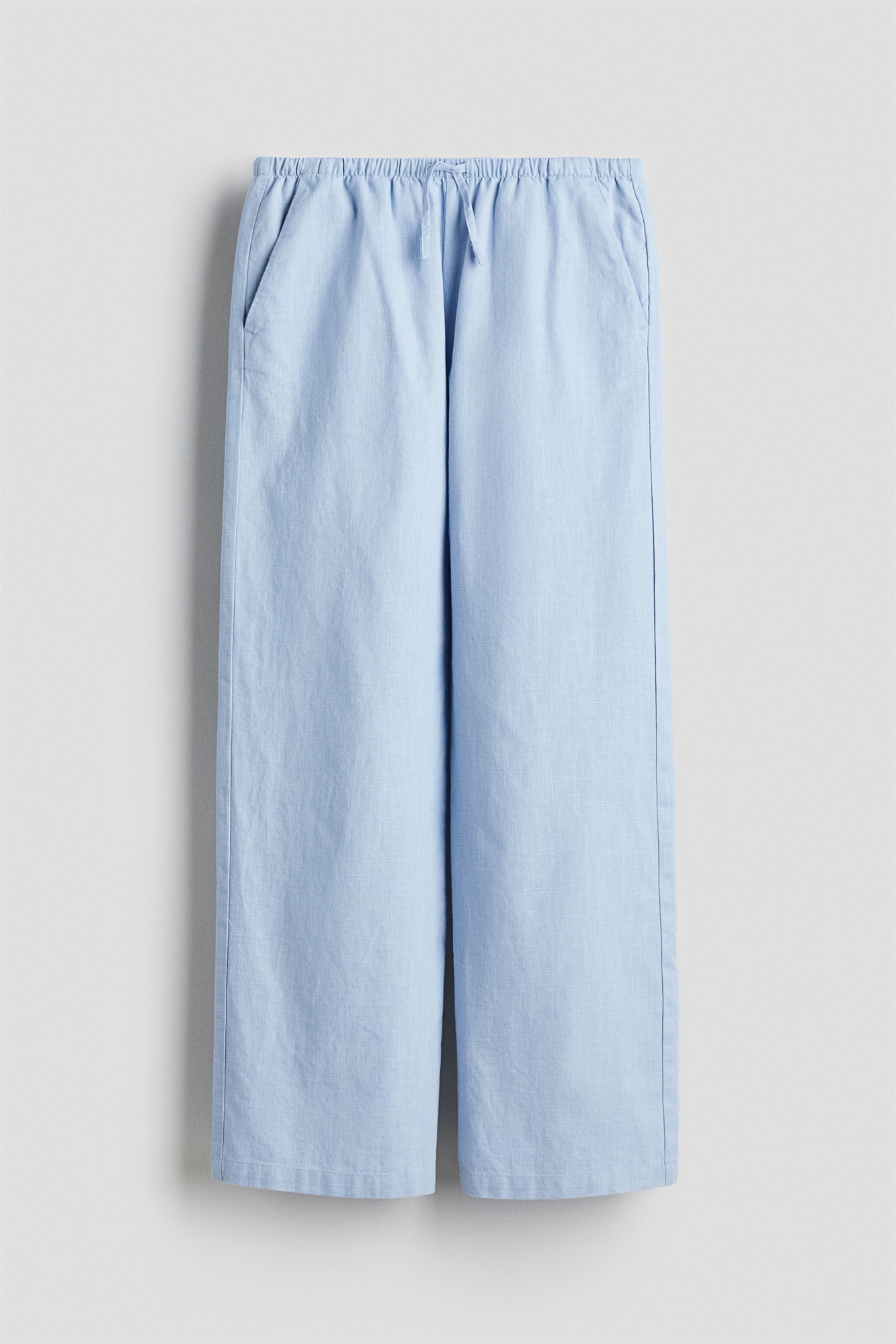 Брюки с мягким плетением из смеси хлопка и льна. Эластичный пояс с завязками, диагональные боковые карманы, накладные задние карманы и прямые ноги.