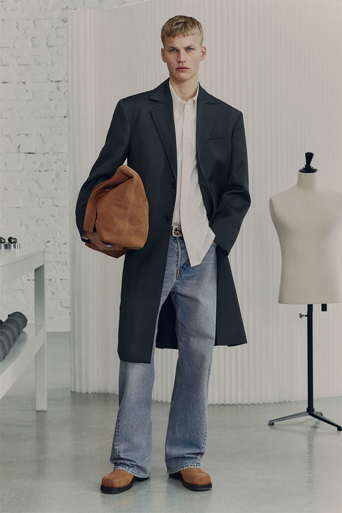 H&M Atelier. Однобортное пальто длиной до колен из саржи, изготовленной из смеси шерсти и вискозы итальянскими производителями тканей Arpatex. Лацканы с вырезом и декоративной петлей для пуговицы, застежка на две пуговицы спереди. Свободный крой с нагрудным карманом, втачными передними карманами с клапаном и двумя втачными внутренними карманами. Декоративные пуговицы на манжетах и один задний клапан. Подкладка из вискозной саржи.