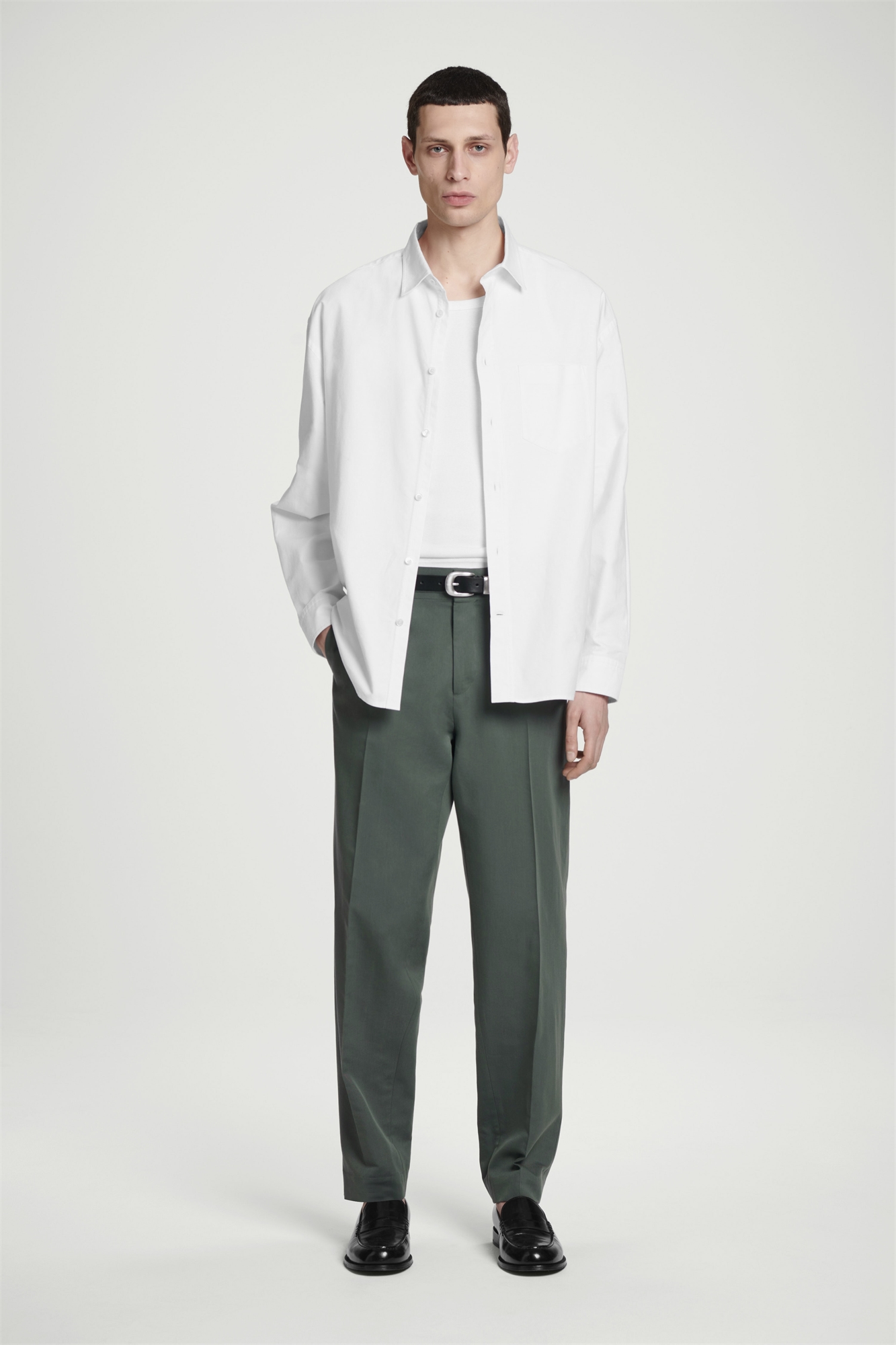 Эти брюки с прямым кроем имеют продуманные детали, которые демонстрируют нашу приверженность высокому дизайну, например, двойные швы на талии, создающие эффект складок. Они изготовлены из хлопчатобумажной саржи, которая сохраняет свою структуру. Regular fitЗастежка на крючок, планку и молнию Материал: 54% вискоза, 46% хлопок. Подкладка карманов: 100% хлопок. Без учета отделки / Машинная стирка Внутренняя длина ноги размера EU 48 составляет 76,5 см / Модель носит размер EU 48