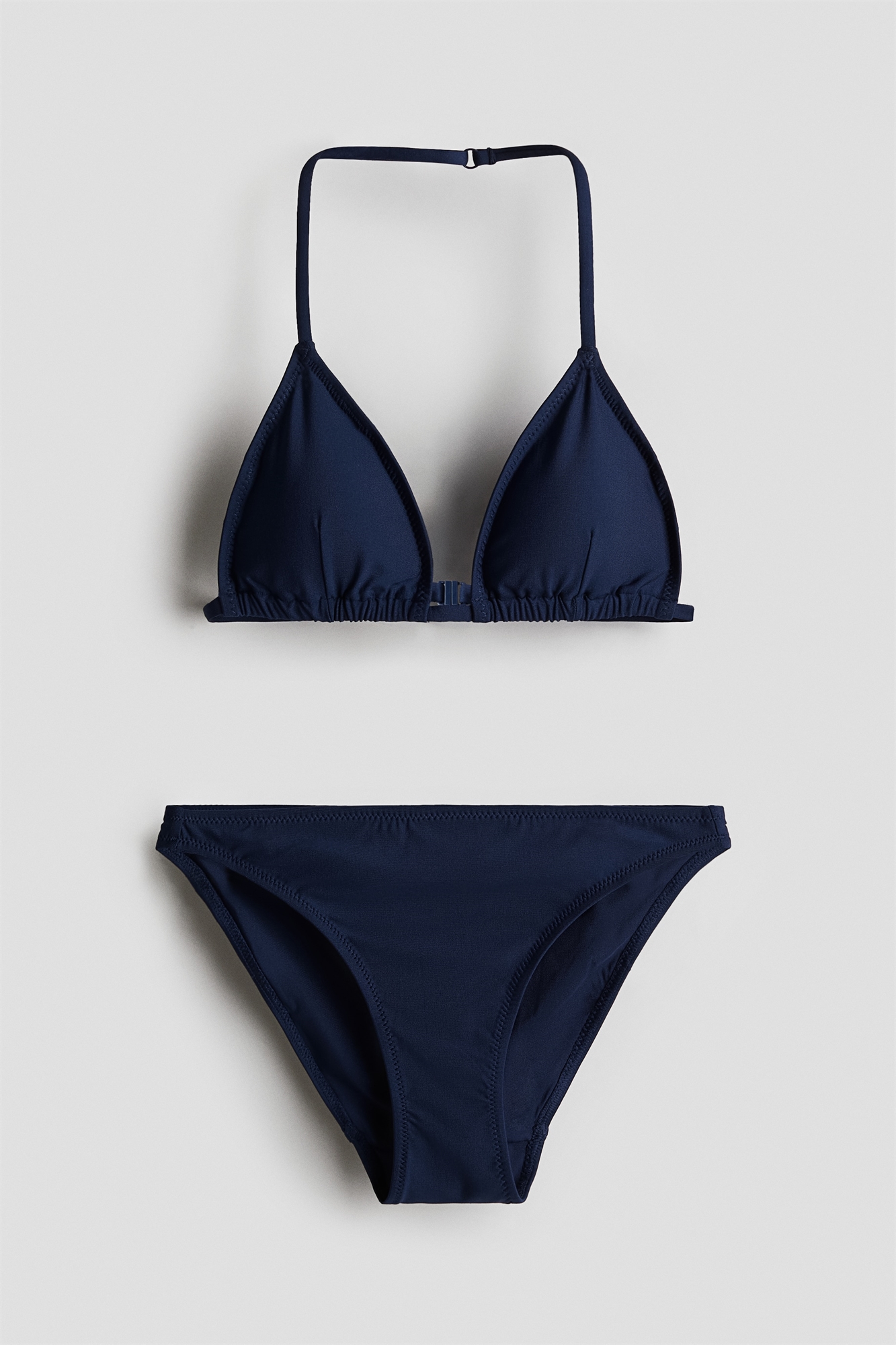 Полностью закрытое бикини с верхней частью с вырезом под халтернек и соответствующими нижними частями. Топ с узкой регулируемой бретелью на шее, пластиковой застежкой сзади и съемными вставками.