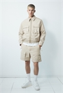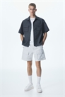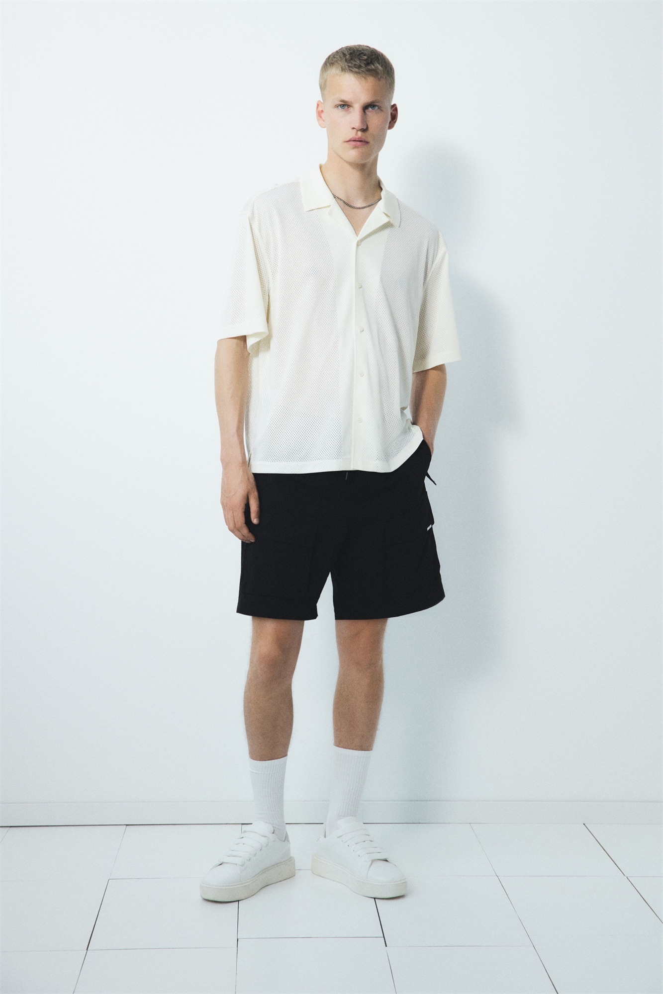 Шорты-карго мягкого плетения из хлопковой смеси с эластичной отделкой и утягивающим шнурком на талии. Фальшивая ширинка, боковые карманы на молнии, накладные карманы на ногах и задние карманы. Свободный крой для непринужденного, но не чрезмерного силуэта.