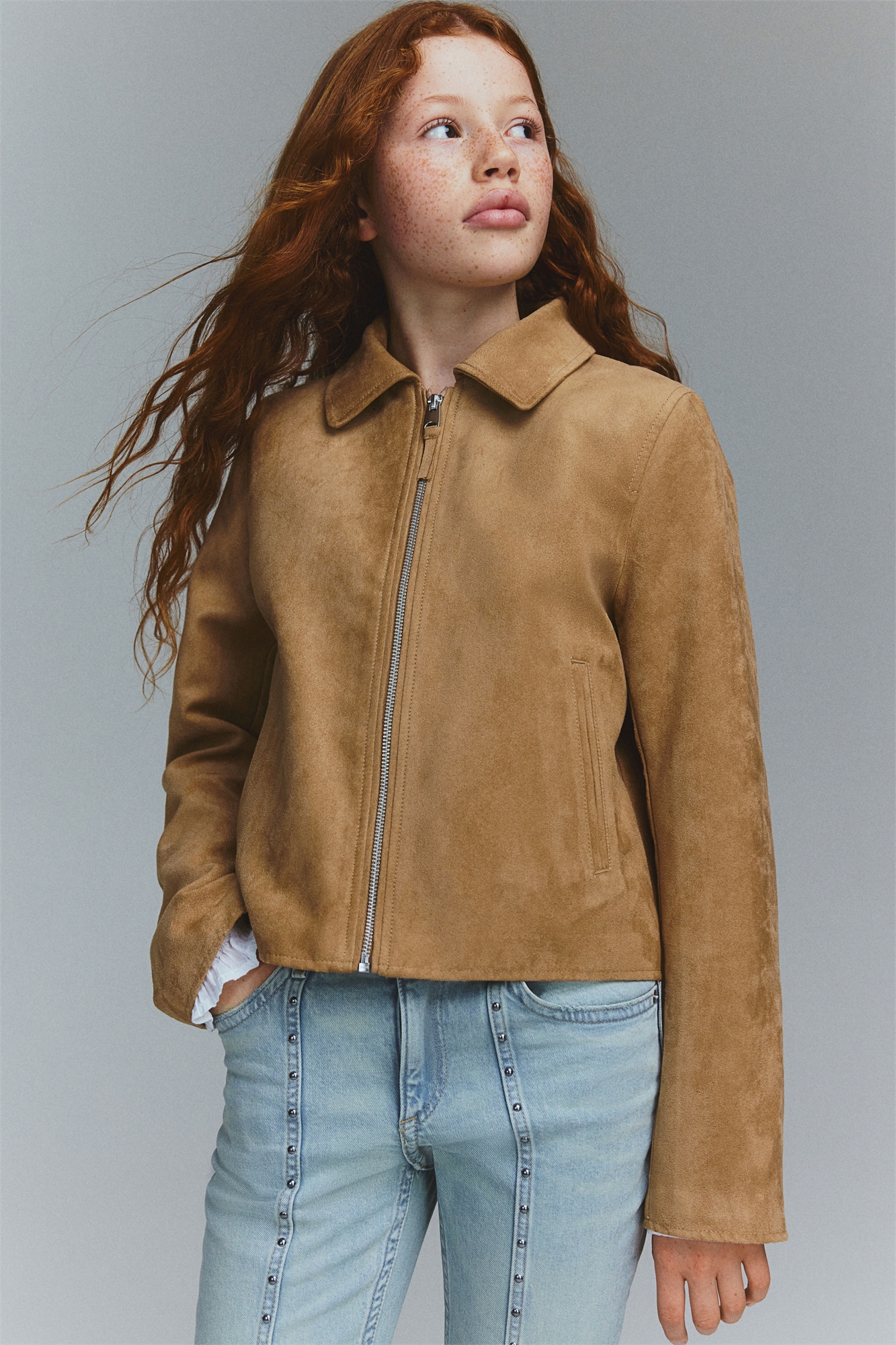 Куртка из ворсистой ткани с отложным воротником, застежкой на молнию спереди и втачными боковыми карманами. На подкладке.