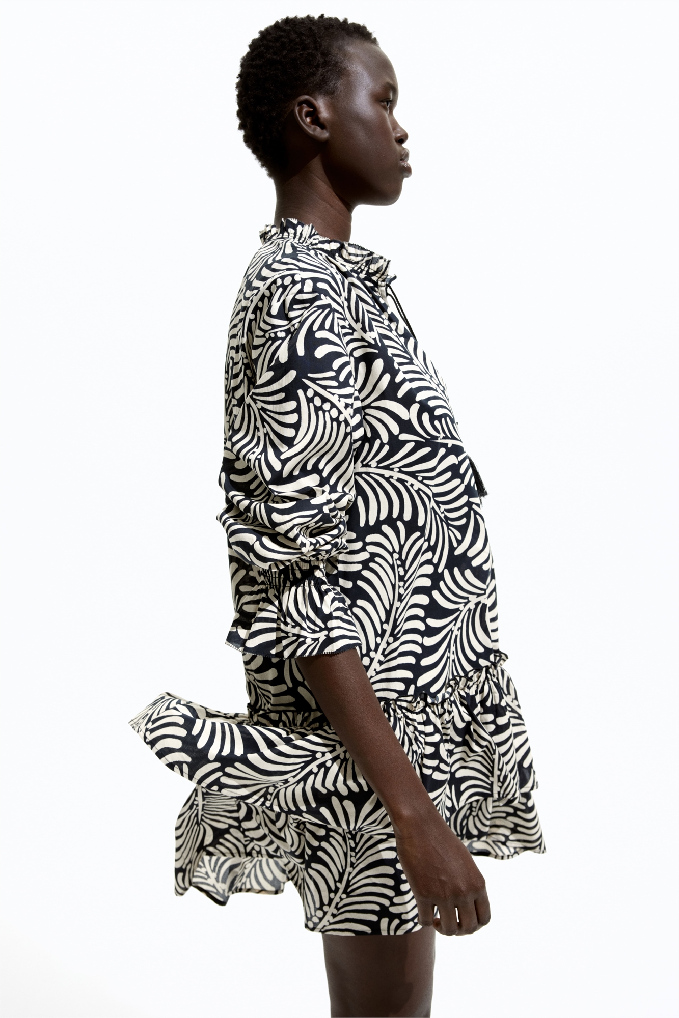 Короткое платье из хлопкового полотна с воротником с оборками и V-образной проймой с узкими завязками спереди. Длинные рукава-баллон с манжетами с воланами, узкий пояс на талии и расклешенная юбка с небольшой оборкой и ярусами воланов. Воротник и манжеты отделаны эластичной тесьмой. Без подкладки.