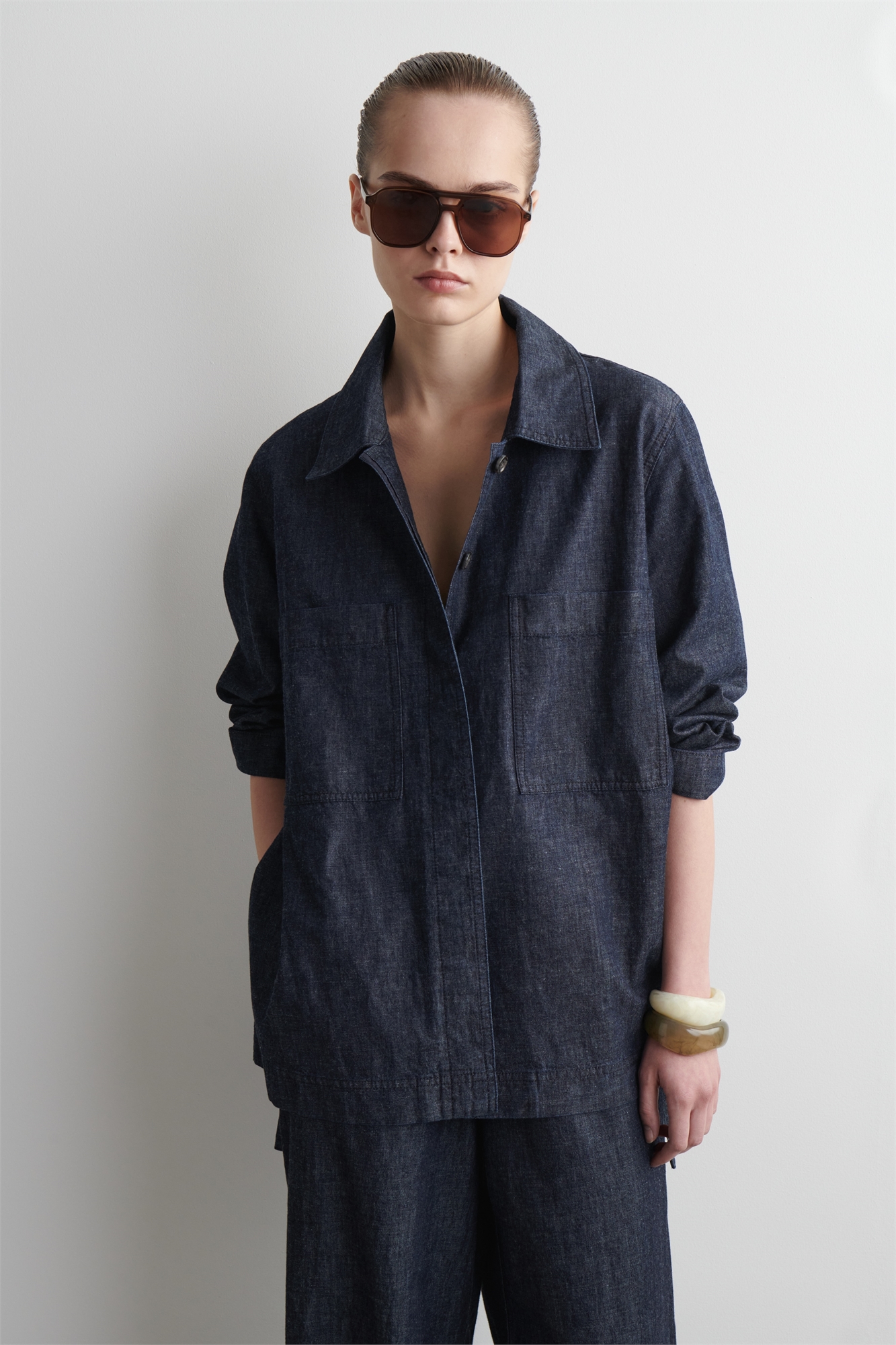 Команда женской одежды смягчает классические джинсовые коды для сезона весна-лето 2025. Эта рубашка цвета индиго имеет непринужденный крой, накладные карманы и тональные завязки по обеим сторонам. Она изготовлена из органического хлопка с нотками льна для тактильной привлекательности. Свободный кройЗастежка на пуговицыОрганический хлопок выращен из негенетически модифицированных семян без использования химических удобрений и пестицидов Материал: 80% органического хлопка, 20% льна. Подкладка: 100% органический хлопок. Без учета отделки / Машинная стирка Длина по спинке для размера EU 36 составляет 67,9 см / Модель носит размер EU 36