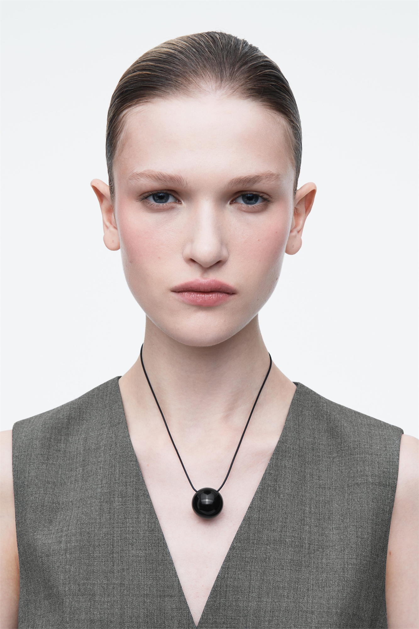 Простая, но яркая подвеска сферической формы изготовлена из черного переработанного стекла и подвешена на узловатом кожаном шнурке с металлическими колпачками. Она станет изысканным завершающим штрихом любого образа. Застежка-галстук Переработанное стекло изготавливается из битых осколков, которые подвергаются процессу нагревания, охлаждения и формовки Состав: 70% переработанное стекло, 20% кожа, 10% переработанная латунь. Без учета отделки