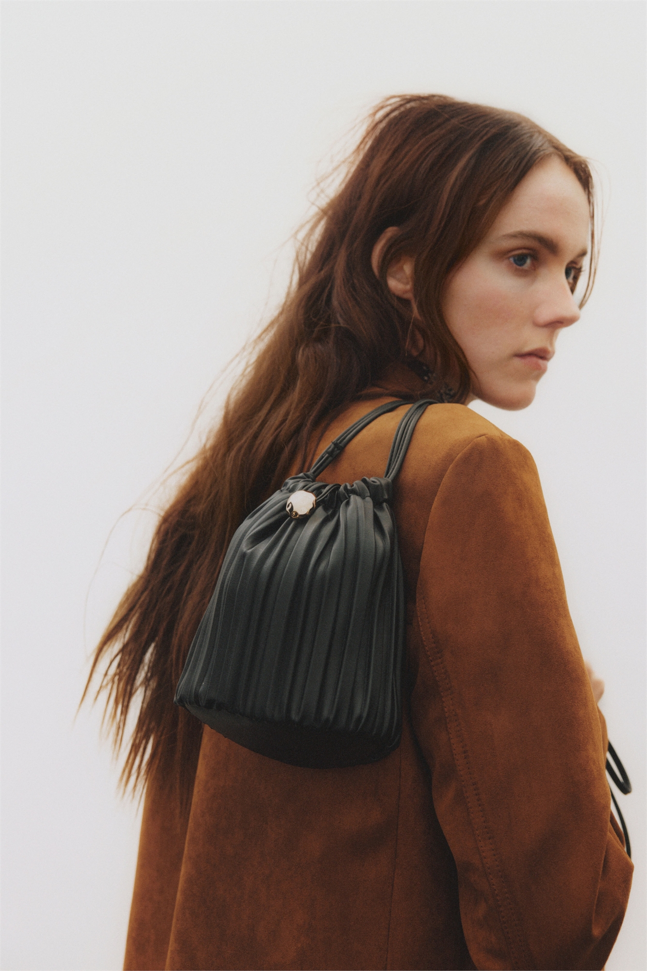 Плиссированная сумка для телефона из ткани с покрытием, застежка на шнурке и двойной плечевой ремень. Металлическая кнопка с молотком спереди. На подкладке. Глубина 9 см. Ширина 15 см. Высота 18 см.