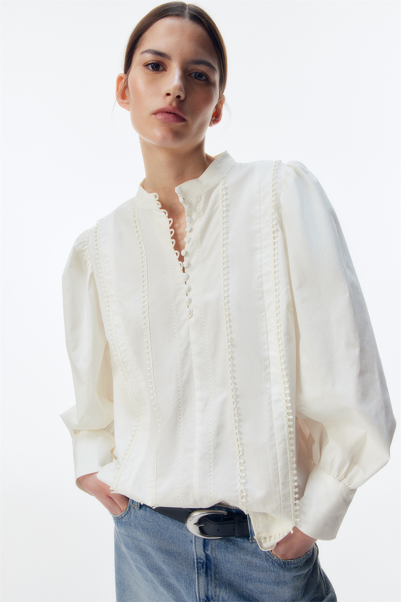Блузка из хлопка с вышивкой и отделкой пико. Воротник-стойка, закрытые пуговицы и длинные пышные рукава с манжетами.