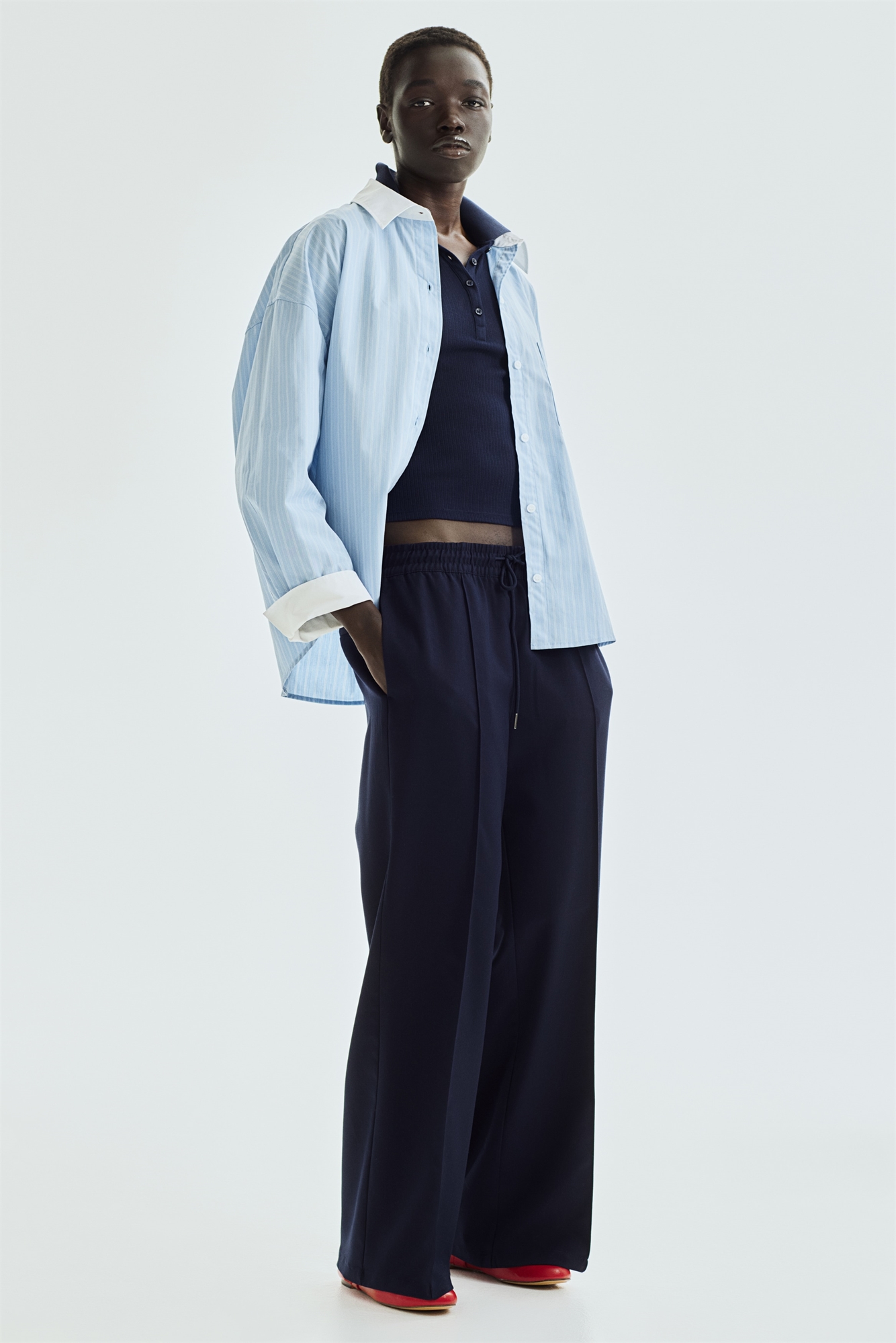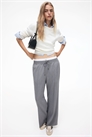 Брюки из саржи с эластичным поясом-кулиской и утягивающим шнурком. Небрежные боковые карманы, задние карманы и широкие штанины со складками спереди.