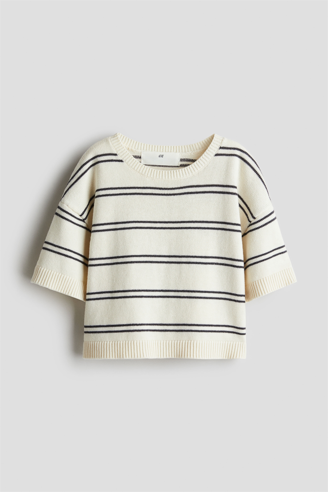Короткий топ из мягкого тонкого трикотажа с круглым ребристым вырезом, спущенными плечами, короткими рукавами и окантовкой на манжетах и подоле.