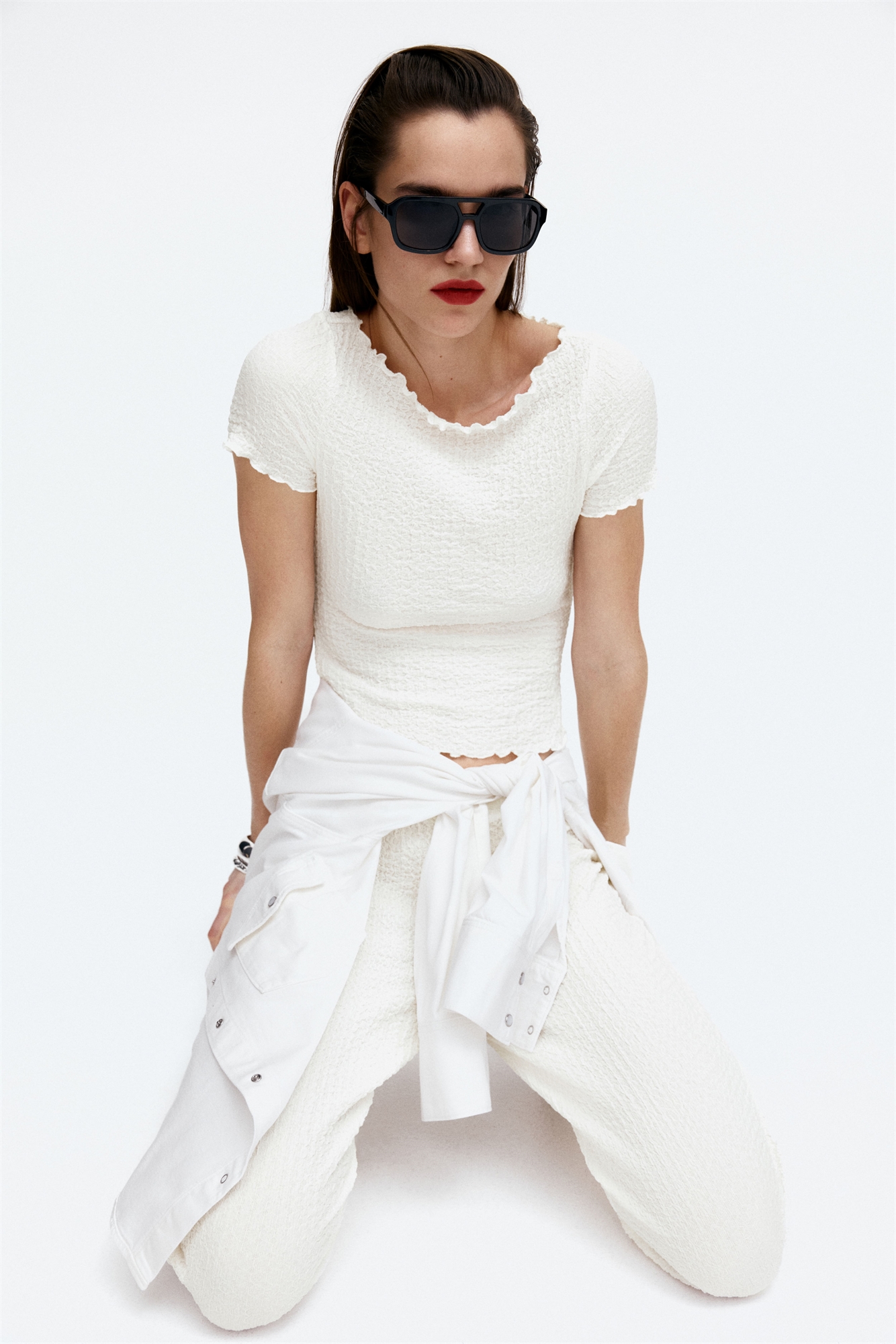 Короткий приталенный топ из мятого трикотажа с оверлоком по краям. Аккуратный вырез-лодочка и короткие рукава.