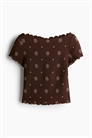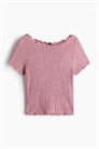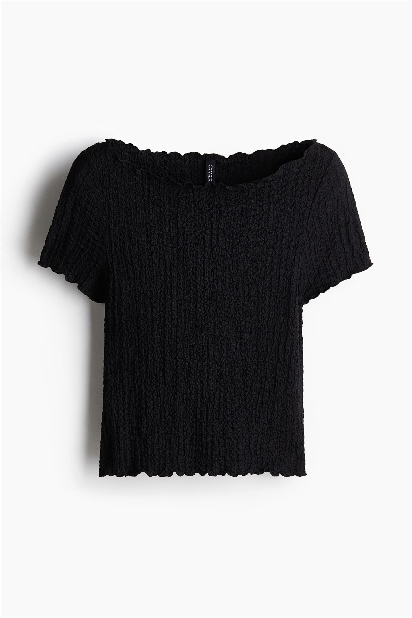 Короткий приталенный топ из мятого трикотажа с оверлоком по краям. Аккуратный вырез-лодочка и короткие рукава.