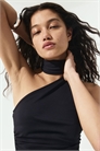 Короткий приталенный топ из эластичного джерси с асимметричным вырезом, бретелью на одно плечо и широкими завязками на шее. Сборки по бокам создают эффект легкой драпировки.