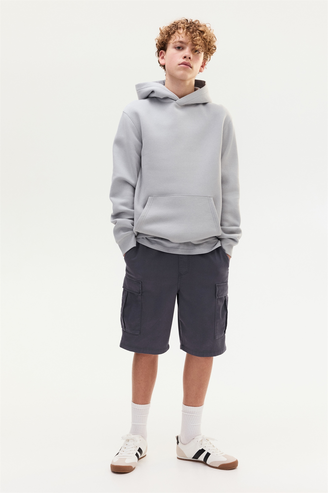 Шорты длиной до колена из мягкой хлопковой саржи с накладными карманами на ногах. Эластичный пояс с завязками и фальшивая ширинка. Диагональные боковые карманы и декоративные задние карманы.