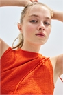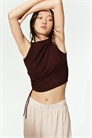Приталенный топ из фактурного джерси с вырезом-лодочкой. Стринги по бокам и на плечах создают эффект драпировки.