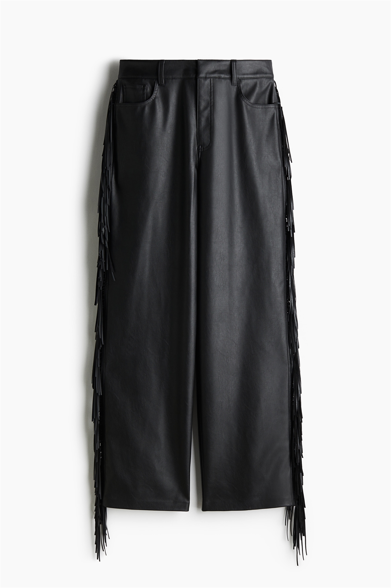 Брюки с 5 карманами из ткани с покрытием и бахромой по бокам. Регулярная талия, ширинка на молнии и потайная застежка на крючок и планку.