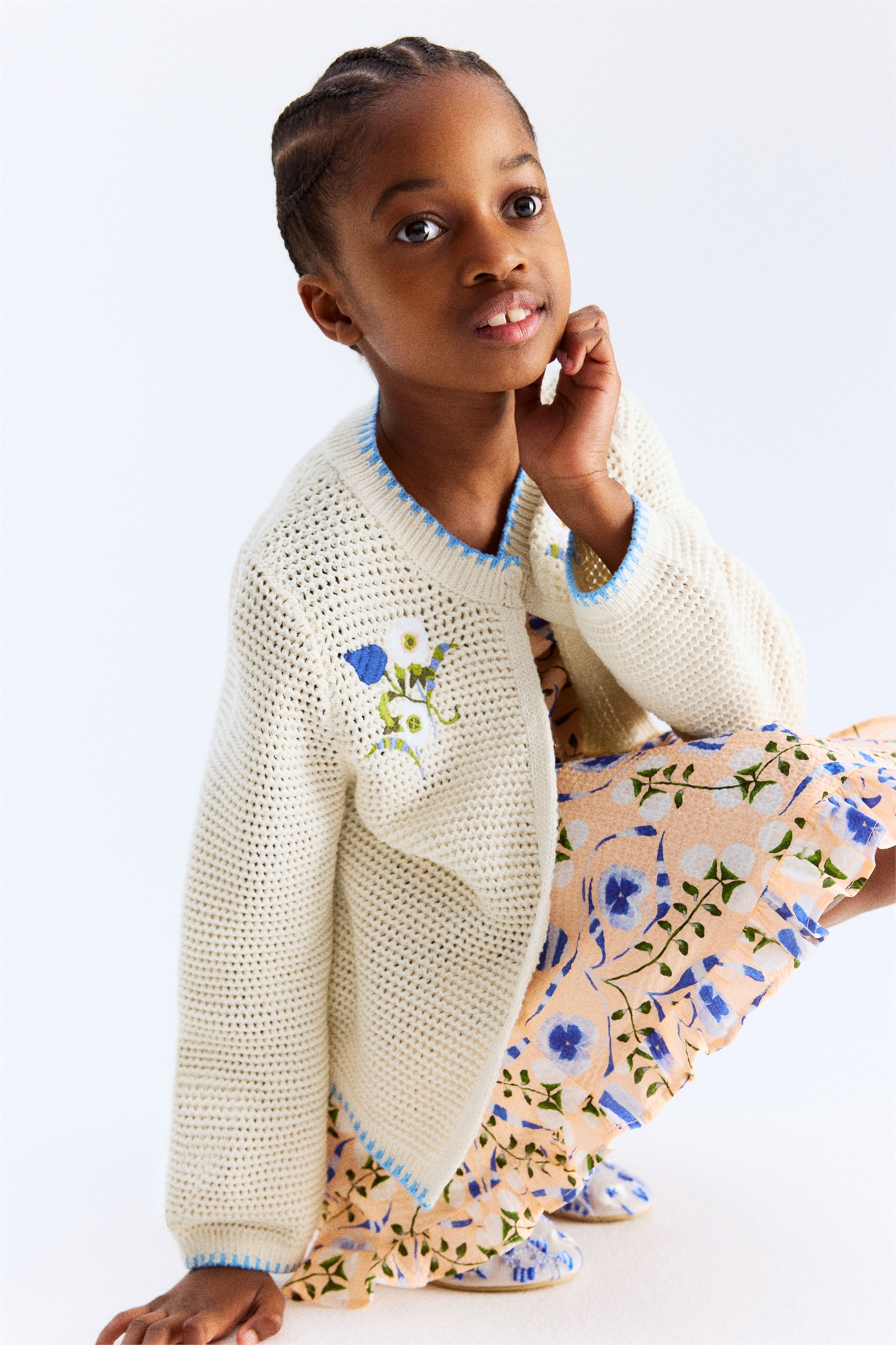 H&M x Georgia Beaumont. Кардиган с длинными рукавами из мягкого вязаного трикотажа с вышитыми мотивами спереди, круглым вырезом и открытой передней частью с пуговицей в верхней части. Ребристая отделка акцентного цвета по вырезу, манжетам и подолу.