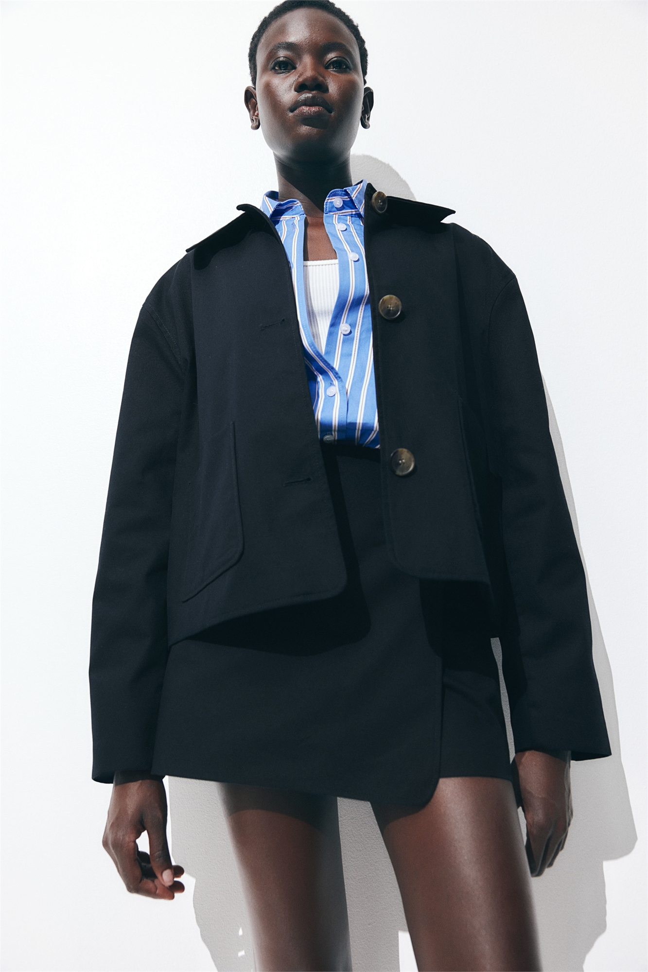 Свободный пиджак из хлопковой саржи с воротником, пуговицами спереди и накладными передними карманами.