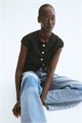 Короткий приталенный топ из тканого материала с круглым вырезом и пуговицами спереди. Рукава реглан, нагрудные вытачки и формирующие швы спереди и сзади. На подкладке.