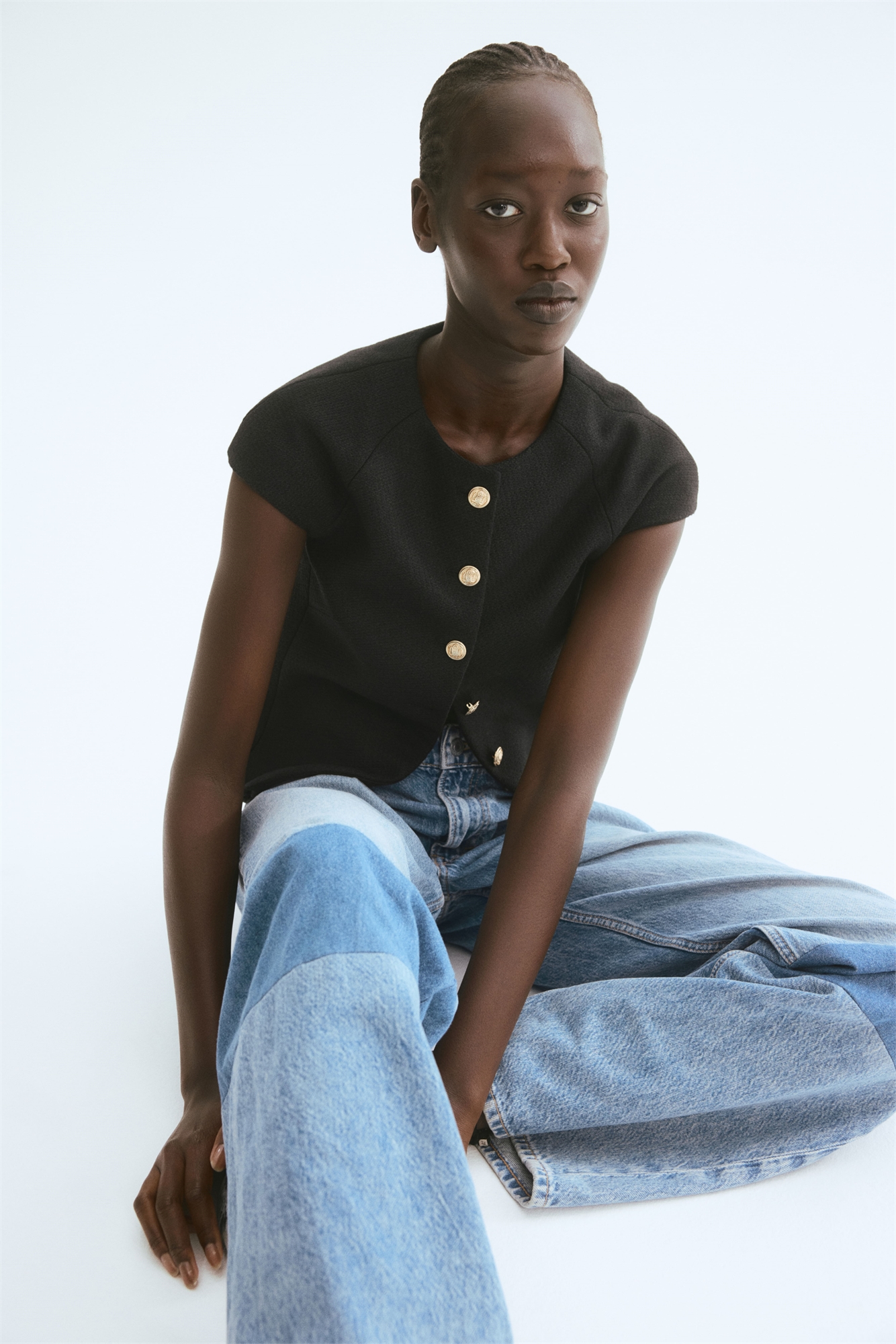 Короткий приталенный топ из тканого материала с круглым вырезом и пуговицами спереди. Рукава реглан, нагрудные вытачки и формирующие швы спереди и сзади. На подкладке.