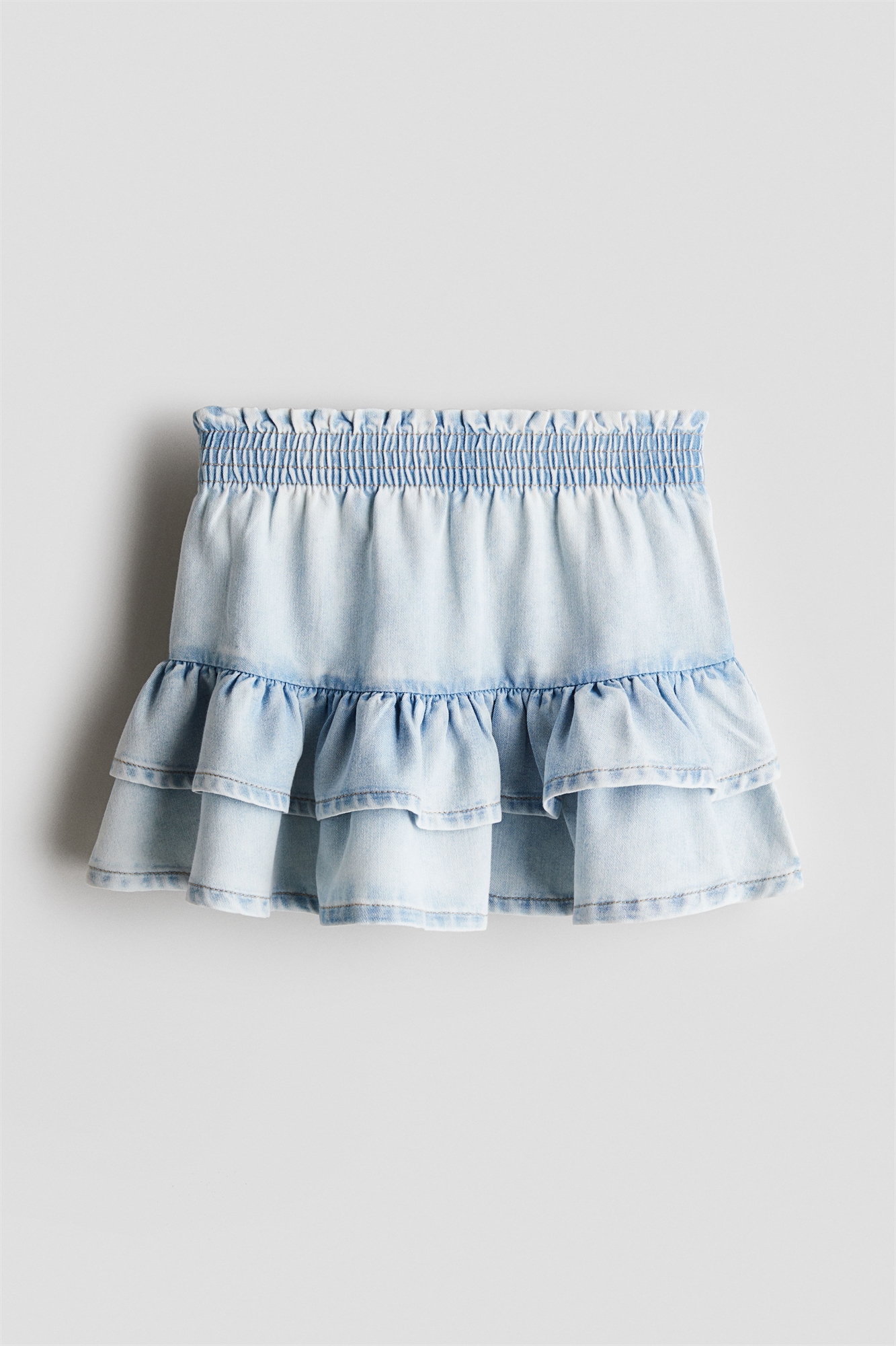 Юбка из мягкого денима с завязками, оборкой на талии и расклешенным подолом с ярусами.