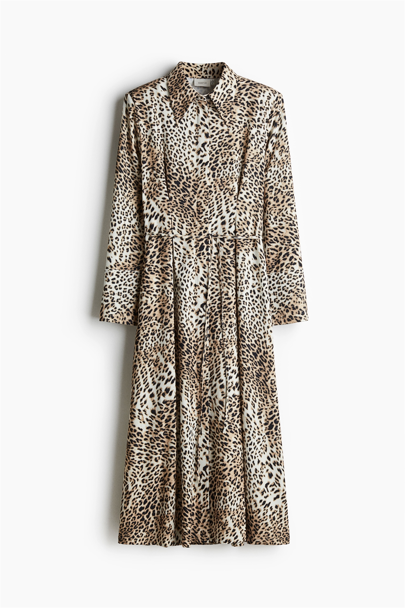 Длинное платье-рубашка из легкой тканой ткани со стрейчем. Платье имеет обычный крой, длинные рукава и длину до щиколотки. Детали с вытачками создают облегающую талию. С узкой лентой, которую можно завязать на талии. Скрытая застежка на пуговицах спереди