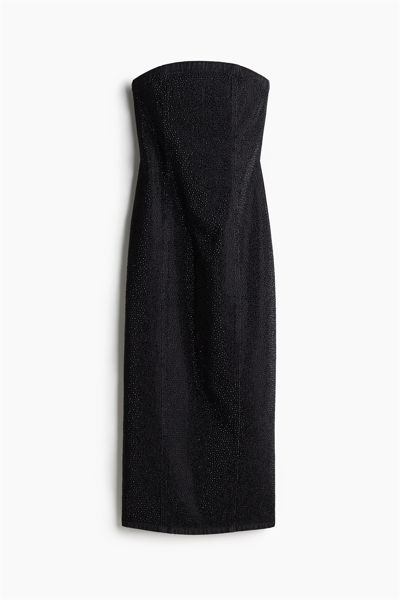 Очень короткое платье с прикрепленными черными стразами. Платье сшито из выстиранного денима со стрейчем. Облегающий крой, без бретелей и длиной до щиколоток. Идеально подходит для торжественных случаев.