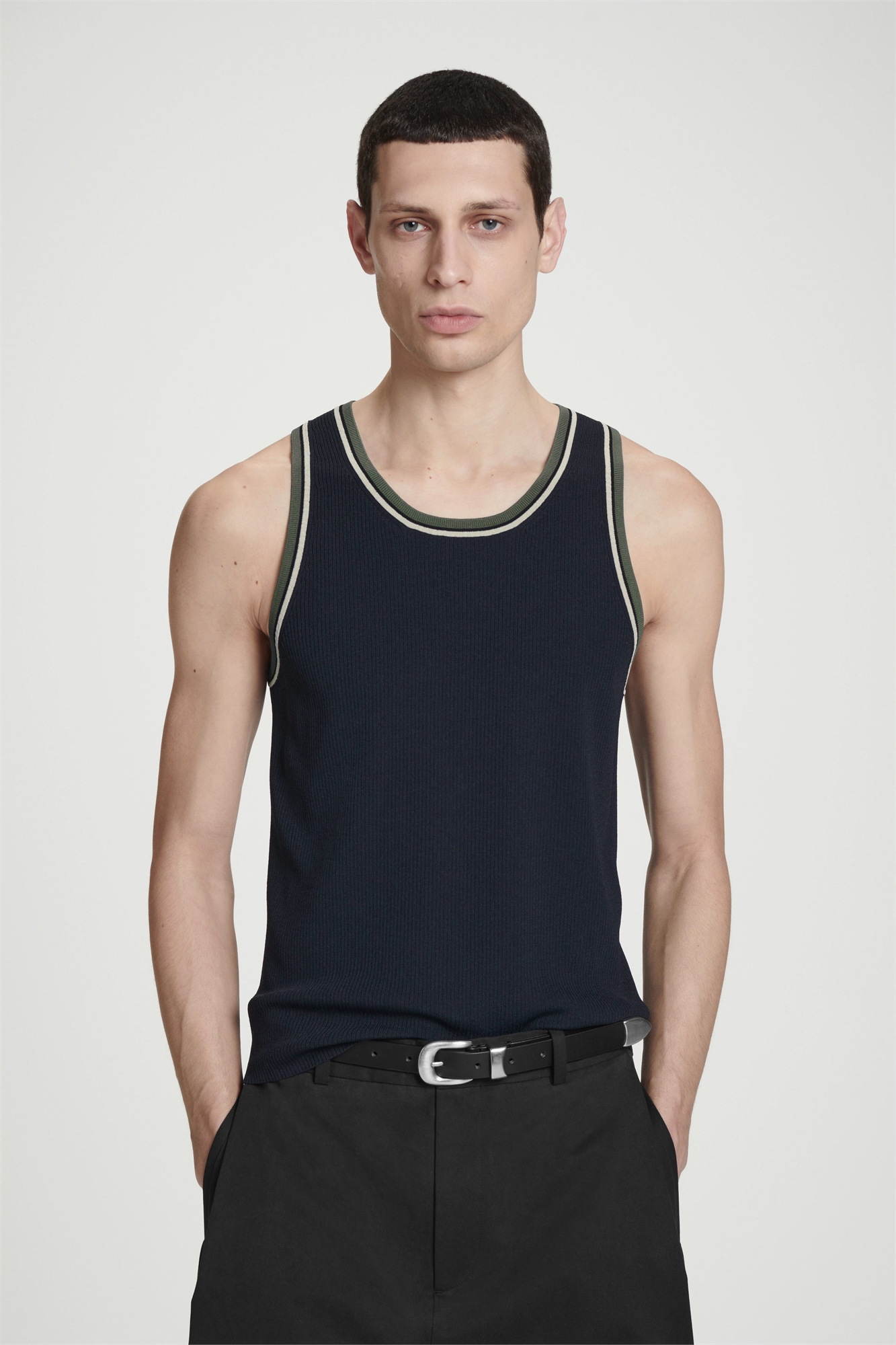 Нежно переосмысленная классика - основа мужской коллекции. Эта майка изготовлена из мягкого трикотажа в рубчик и имеет вырез горловины и контрастную полосатую отделку. Его можно носить как отдельно, так и под рубашку. Обычный кройПереработанный нейлон (полиамид) снижает потребность в ограниченных природных ресурсах и сокращает выбросы парниковых газов Материал: 65% вискоза, 35% переработанный полиамид (переработанный нейлон). Без учета отделки / Машинная стирка Длина по спинке для размера M составляет 62 см / Модель носит размер M