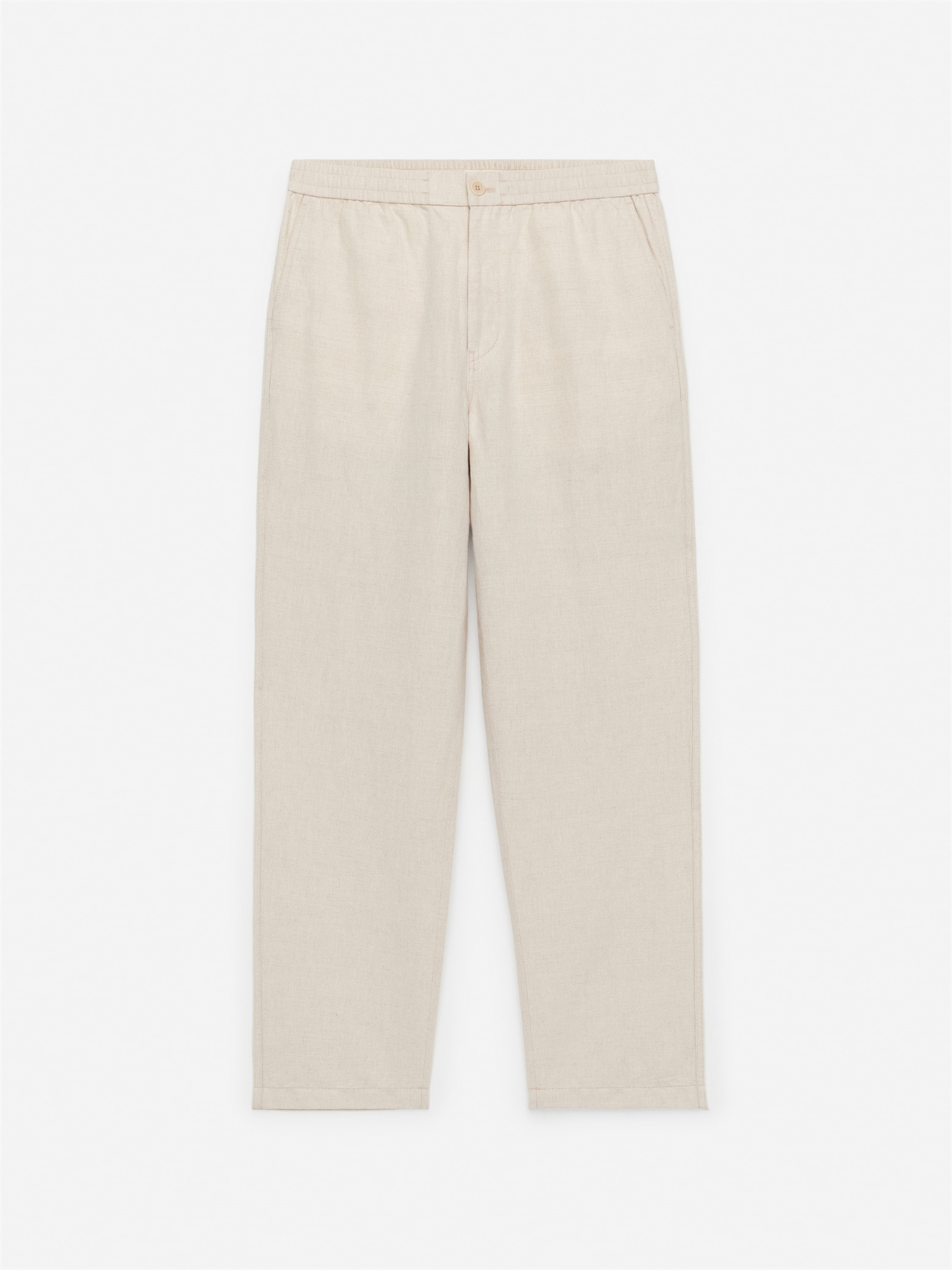 Брюки сшиты из смеси льна. Эластичный пояс с утягивающим шнурком на внутренней стороне, застежка на пуговицах и ширинка на молнии. Косые карманы спереди и втачные карманы сзади. Регулярный крой.