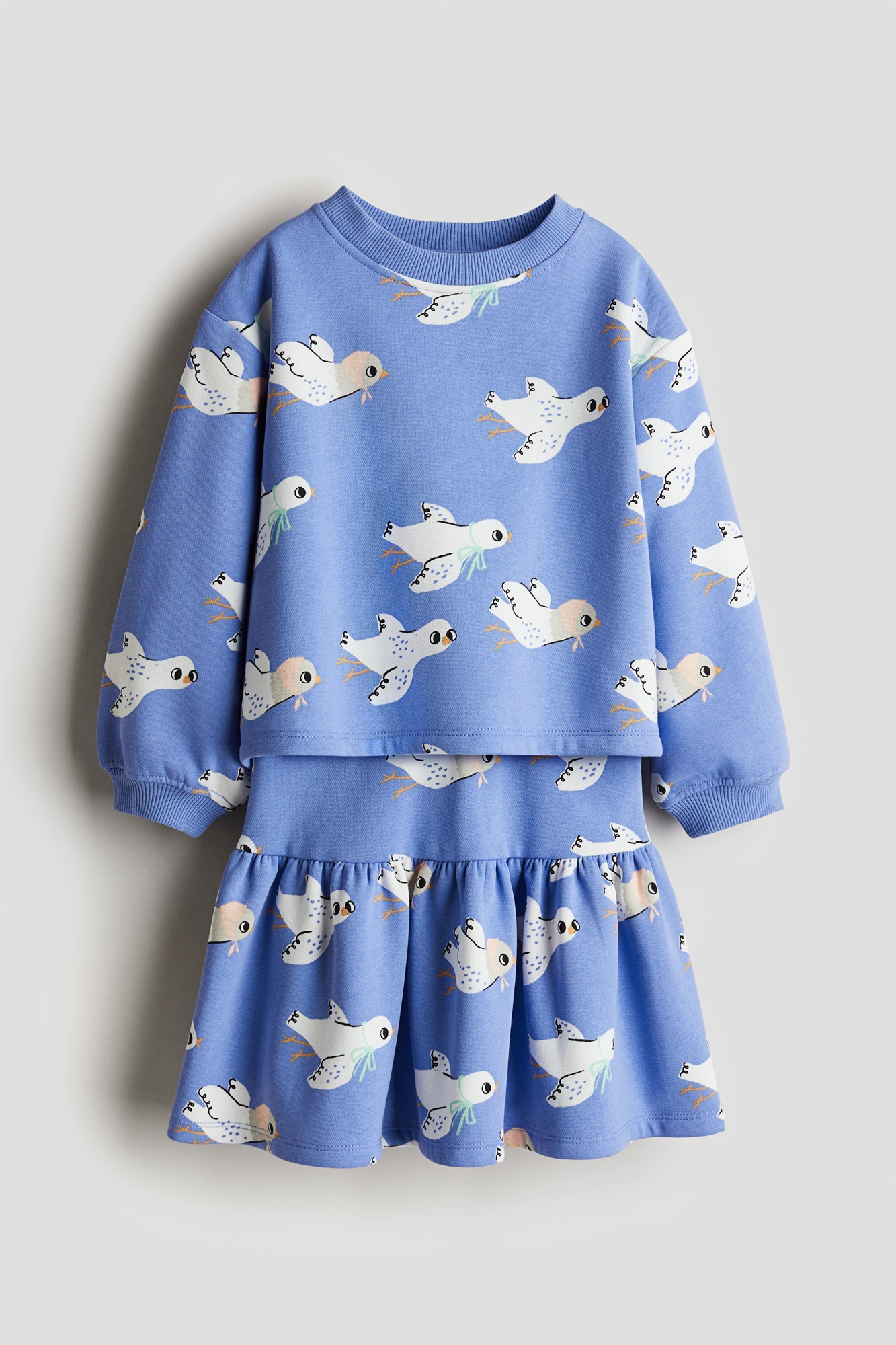 Комплект из топа и юбки из принтованной толстовки с мягким начесом внутри. Топ с круглым вырезом, отделанным ребрами, спущенными плечами и ребрами на манжетах. Объемная юбка со складками и широкой планкой на талии.